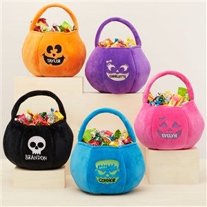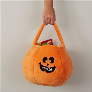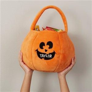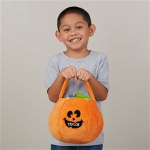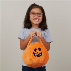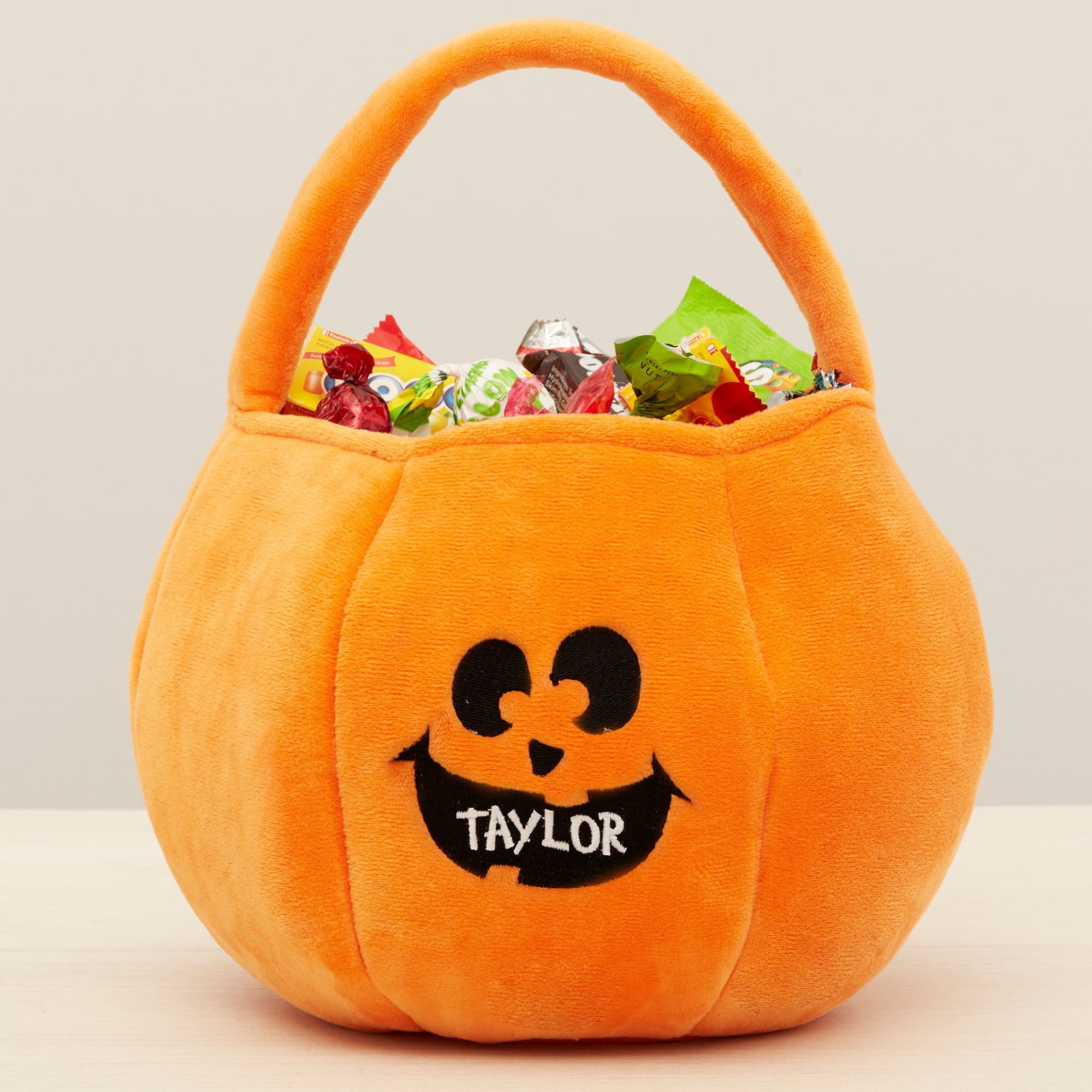 There's no trick to figuring out who owns these goodies, stashed in their very own personalized Jack-o'-Lantern Faces Embroidered Plush Halloween Treat Bag.