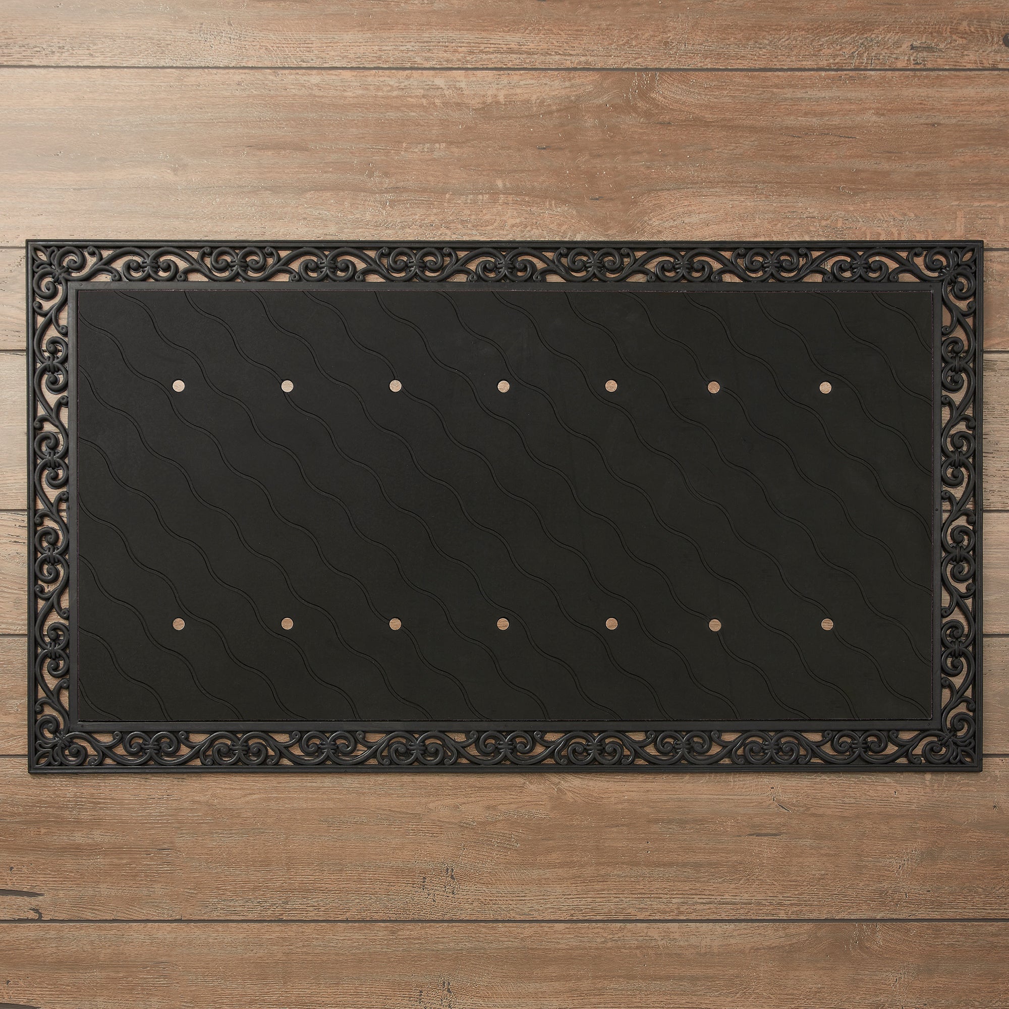 • Made of sturdy, durable, recycled rubber with a decorative scrollwork frame and includes holes on the bottom for draining