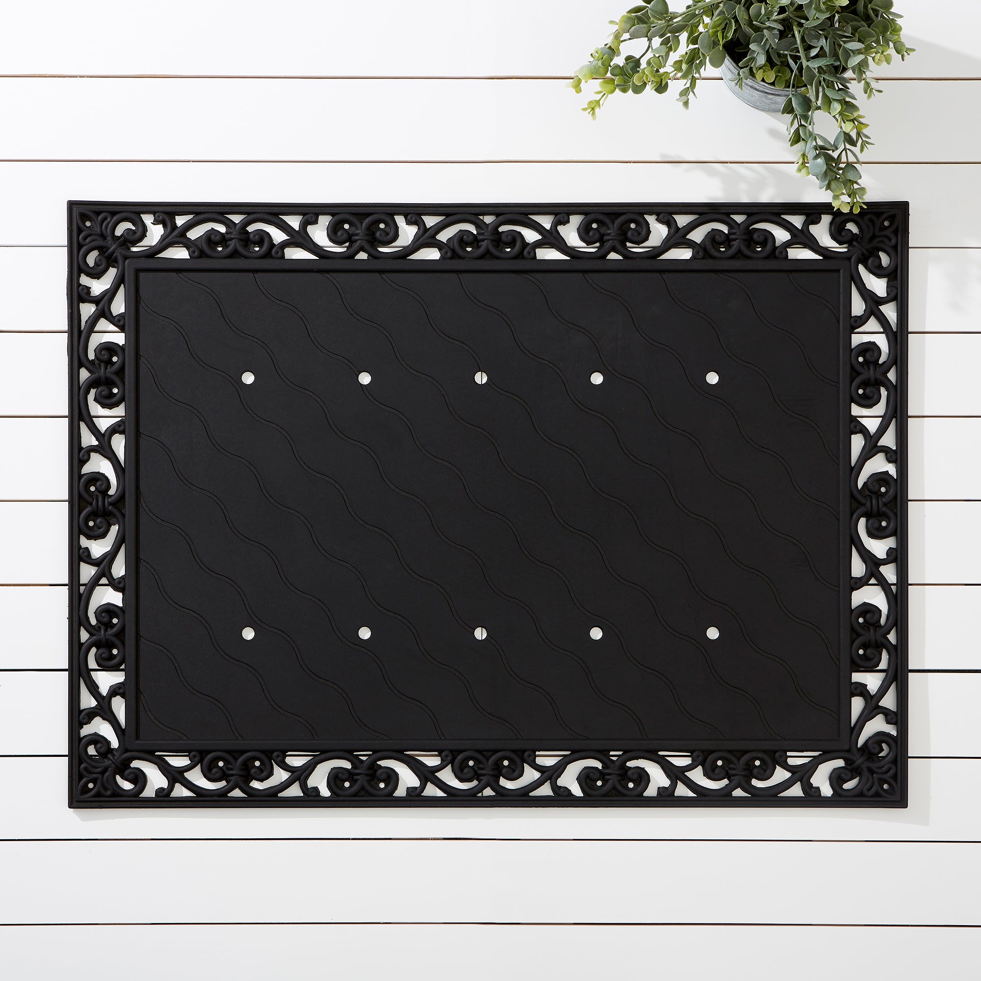 • Made of sturdy, durable, recycled rubber with a decorative scrollwork frame and includes holes on the bottom for draining