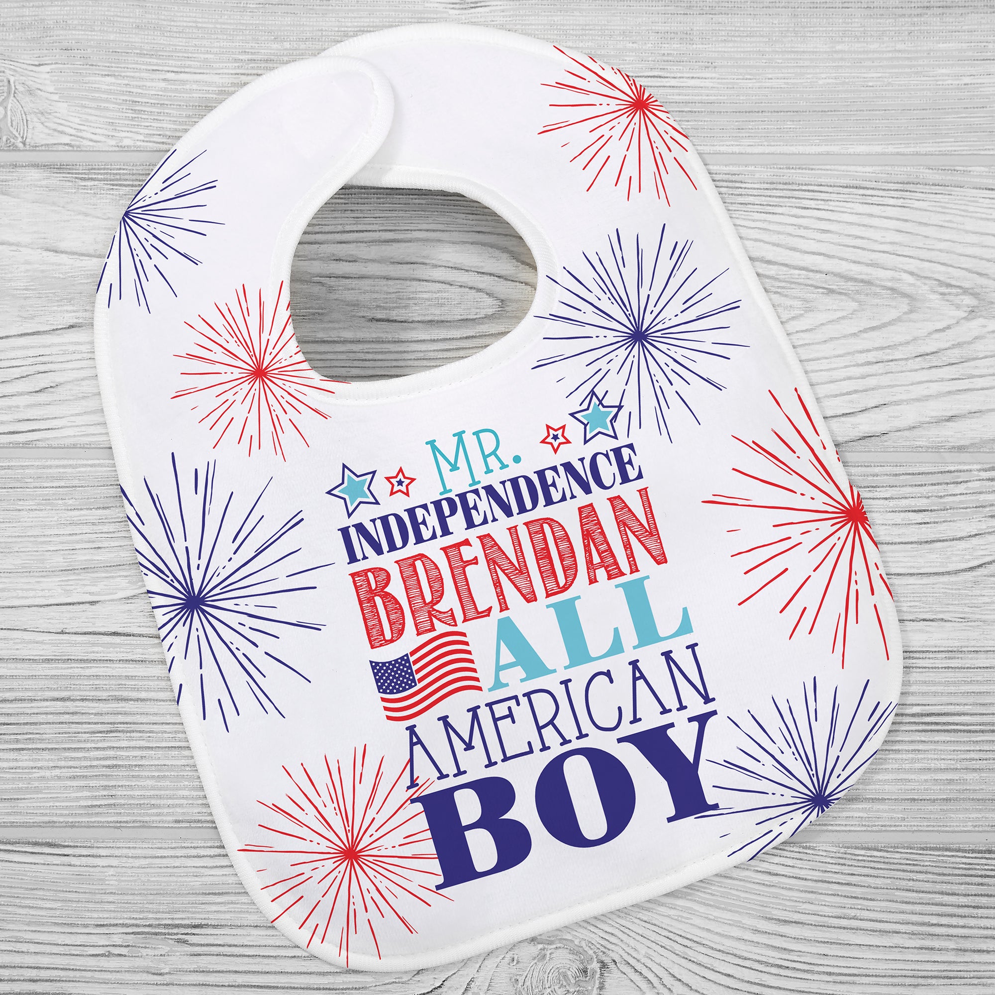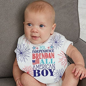 They will take center stage and attract adorable glances from one and all when they are decked out in our adorable Red, White and Blue Personalized Baby Bibs.