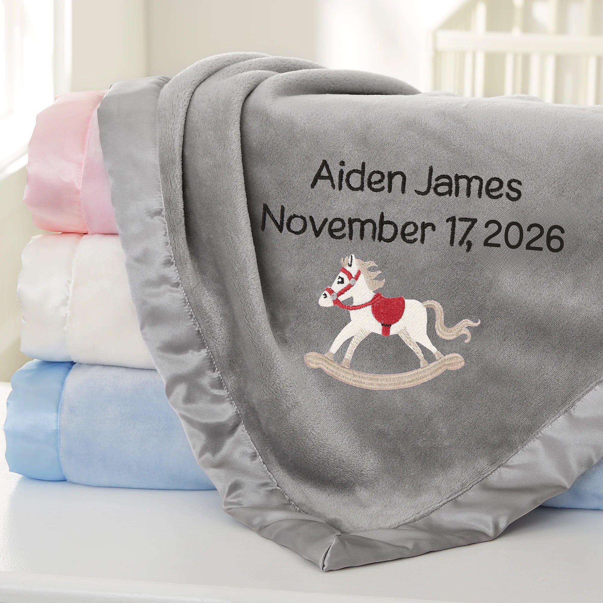 Wrap your bundle of joy up in custom style with our exclusive Rocking Horse Embroidered Satin Trim Baby Blanket, creating a special gift for baby showers or welcoming home a new baby!