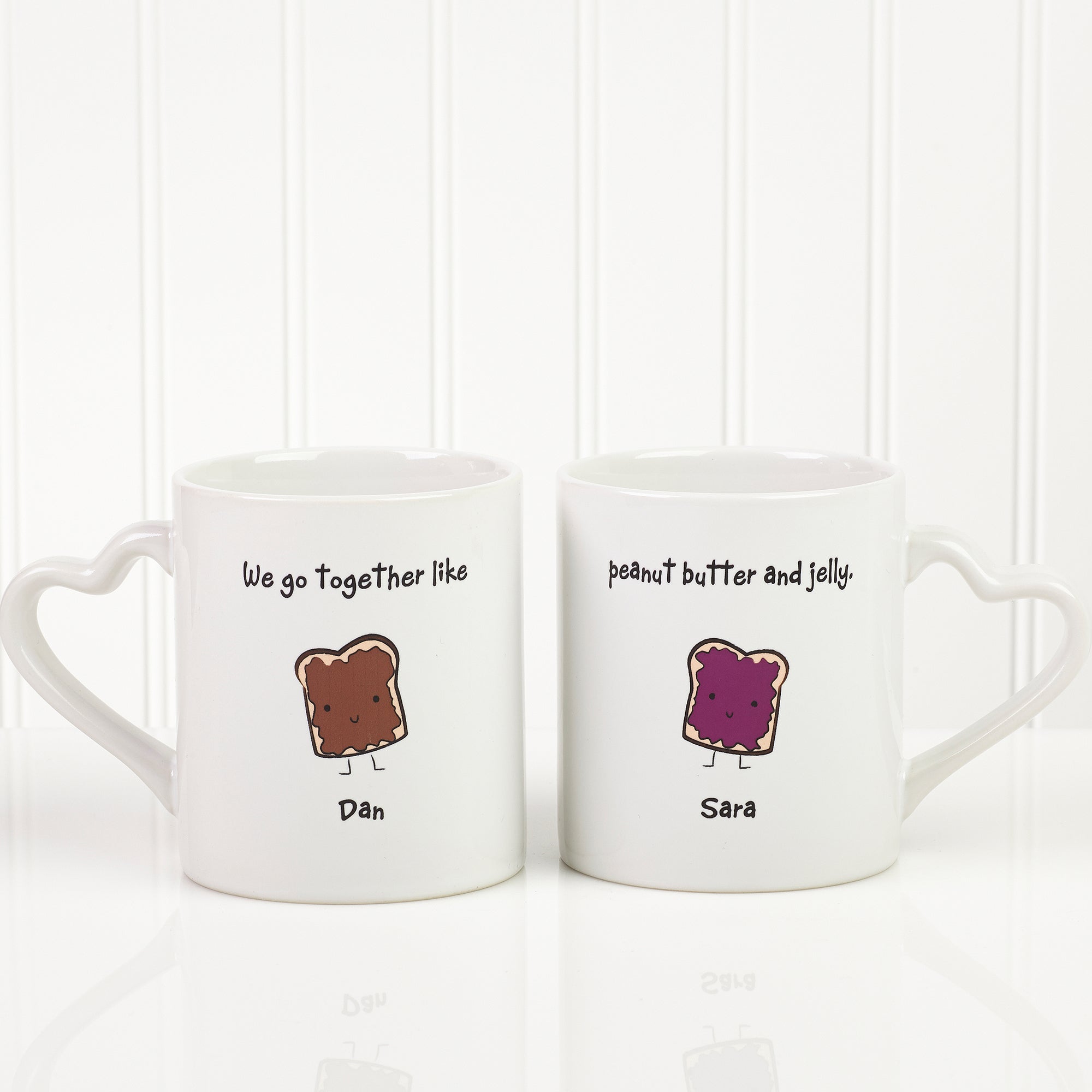 Our fun and creative We Go Together Like... Personalized Mug Set features sculpted heart handles to complete the romantic design.