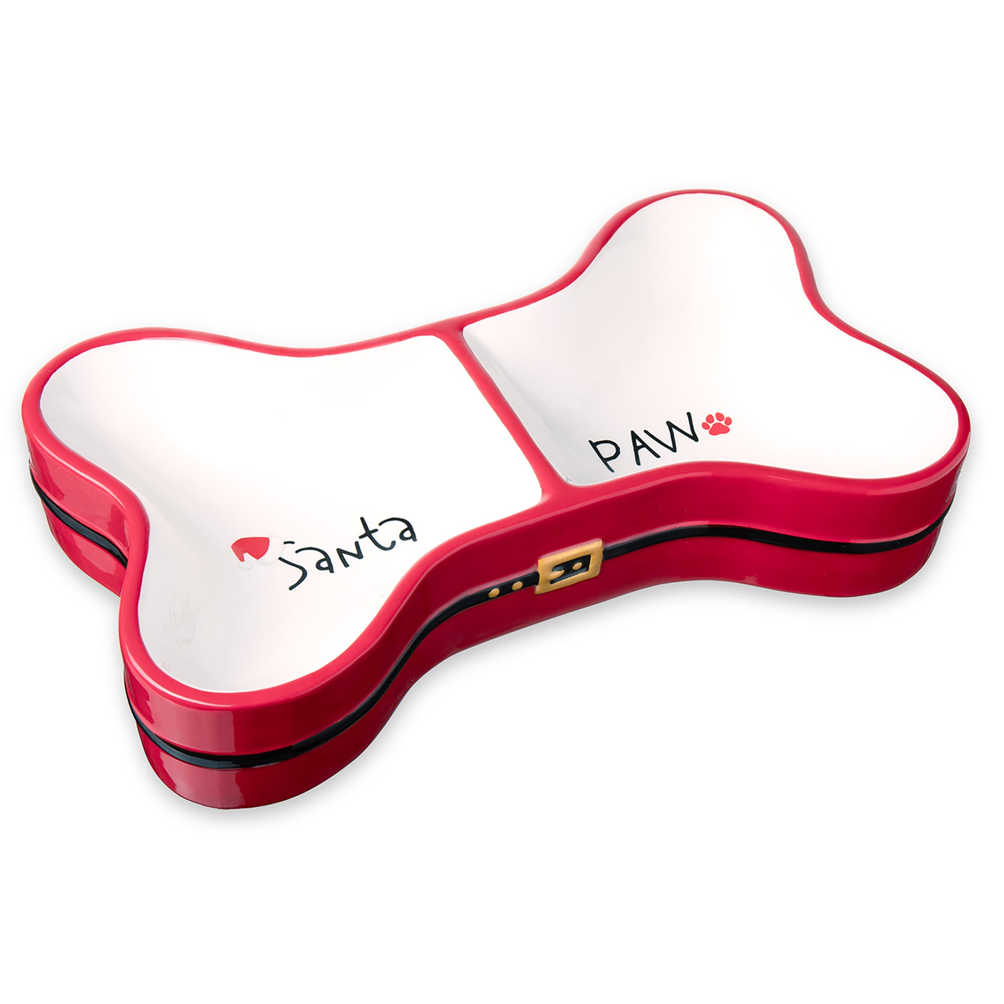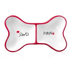 - Ceramic dog bowl in the shape of a bone with "Dear Santa Paw" painted on inside of bowl and santa-style design on exterior
