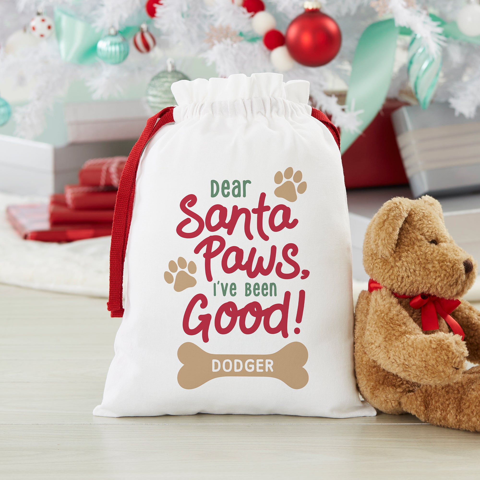 Your pet's tail will start wagging when they see Santa Paws Personalized Canvas Drawstring Santa Sack is filled with toys and treats just for them! Santa approved; this will be a Christmas gift that any pet will enjoy!