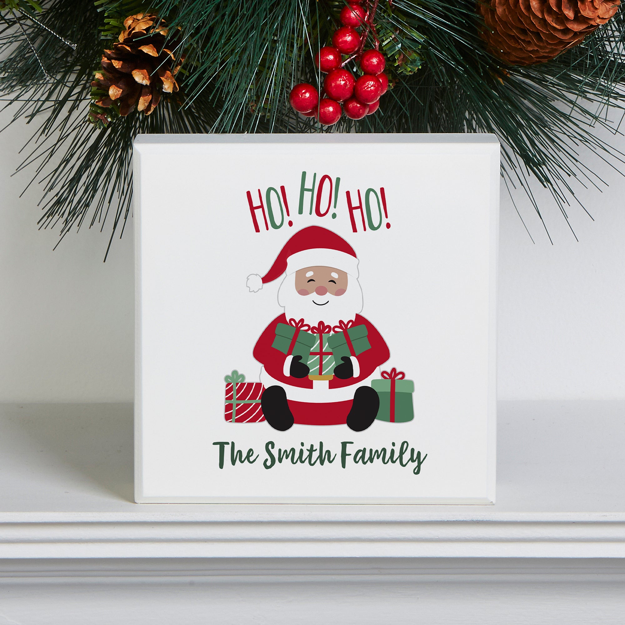 Add a simple, but festive piece of holiday décor with the Santa Personalized Shelf Block.