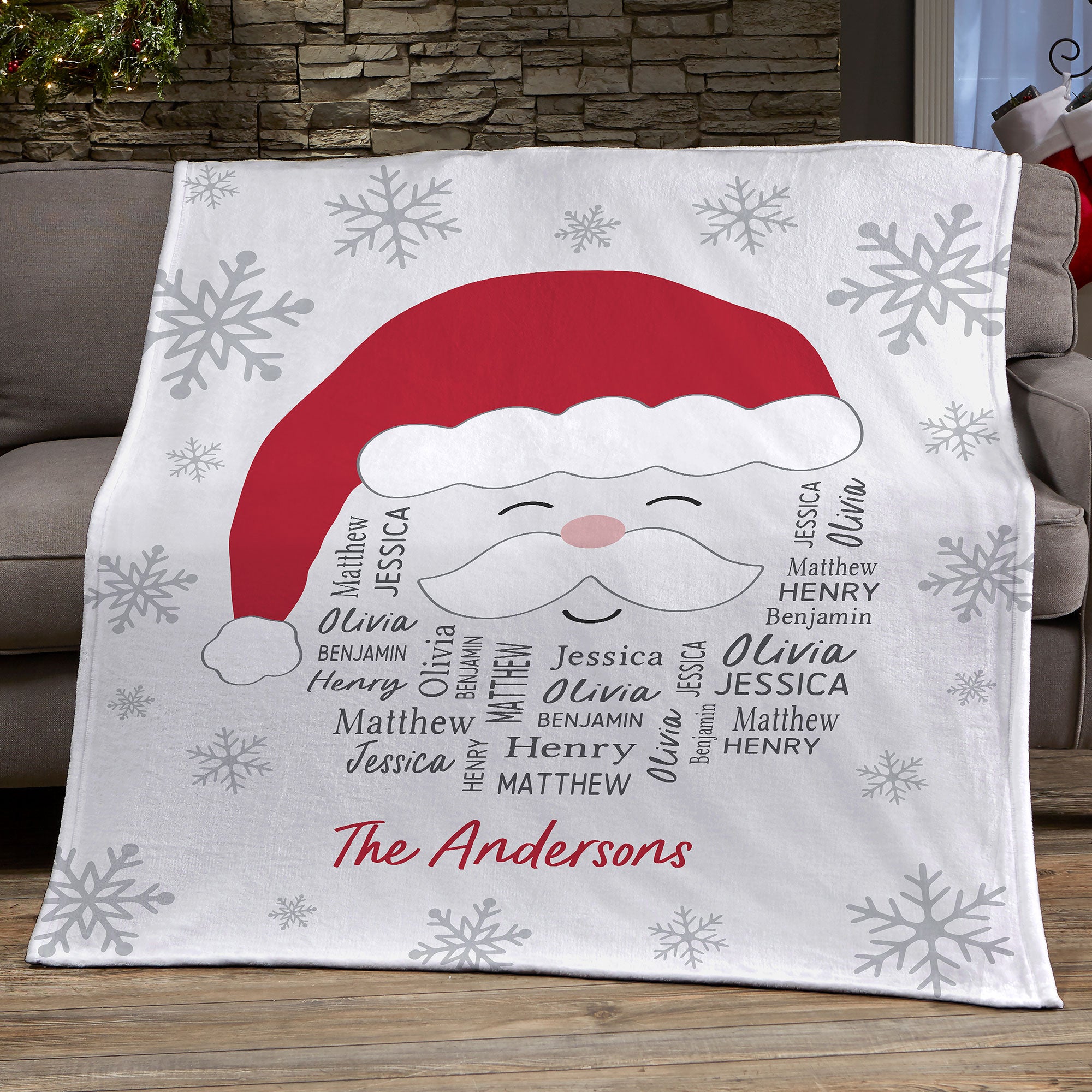 Celebrate the season cuddled up in our Santa Repeating Name Personalized Christmas Blanket. The festive design will add a pop of holiday cheer to any sofa, chair or bed.