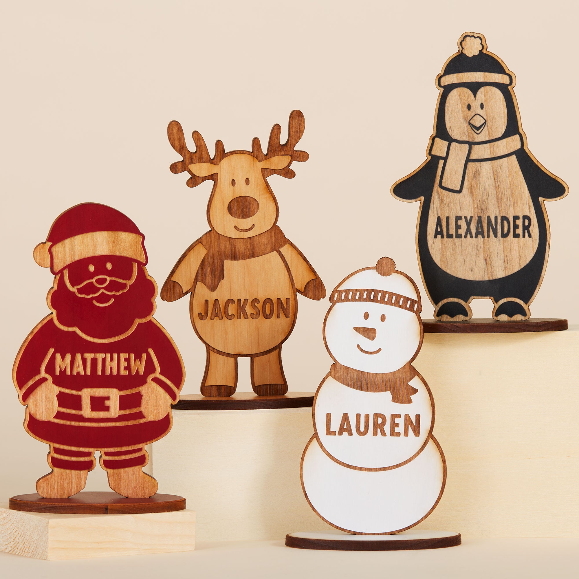 Add a cute and festive holiday decoration to any shelf or place seating with the Santa and Friends Personalized Wood Characters!