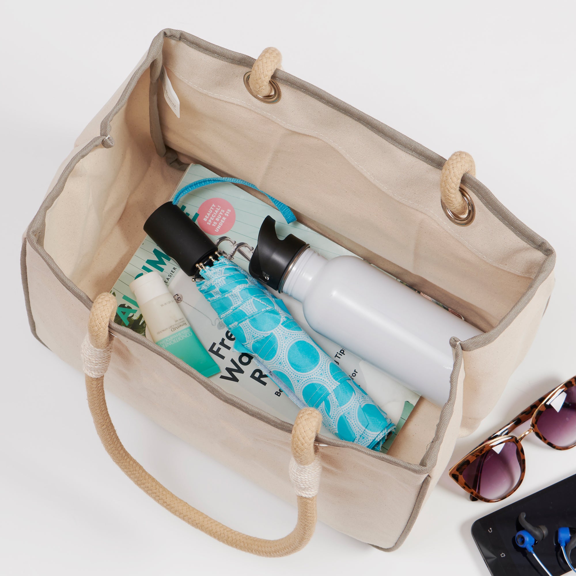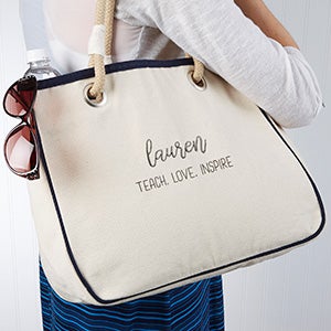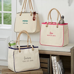 Running errands through town or taking a trip to the beach, call it yours with our Scripty Style Embroidered Canvas Rope Tote.