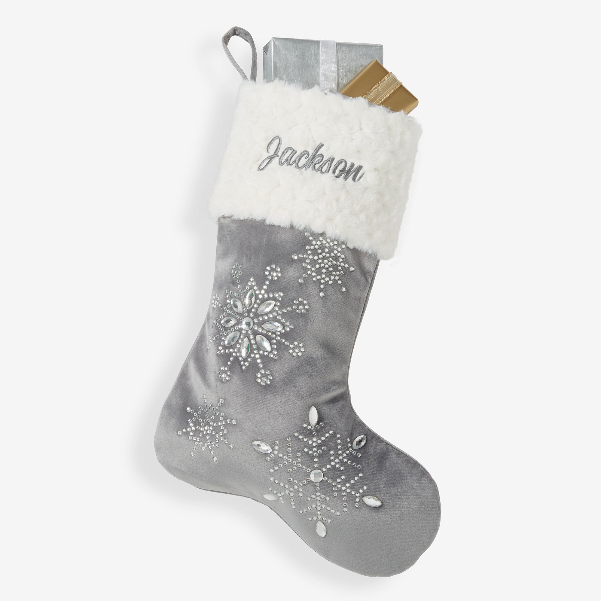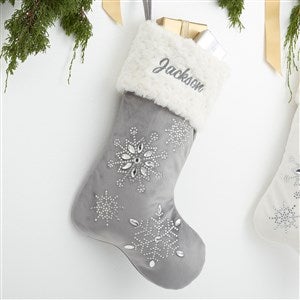 - Grey velvet material accented with elegant clear jeweled snowflakes