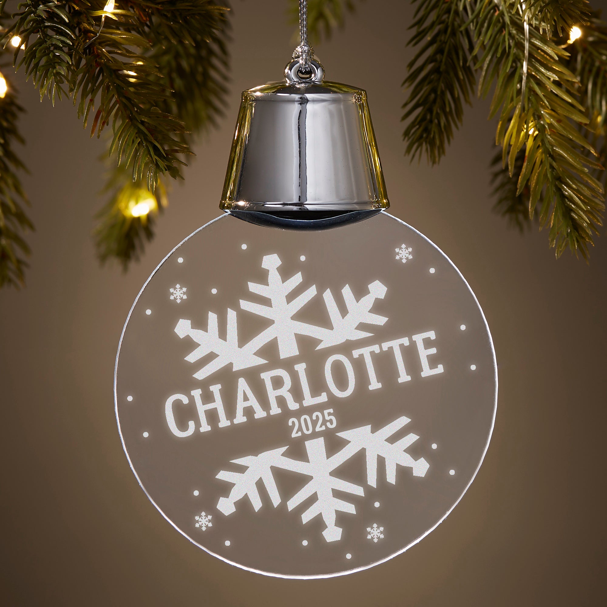 Add a touch of magic to your tree this year with our Snowflake Family Personalized LED Acrylic Ornament. The light flickers the name and snowflakes creating a warm glow against the tree.