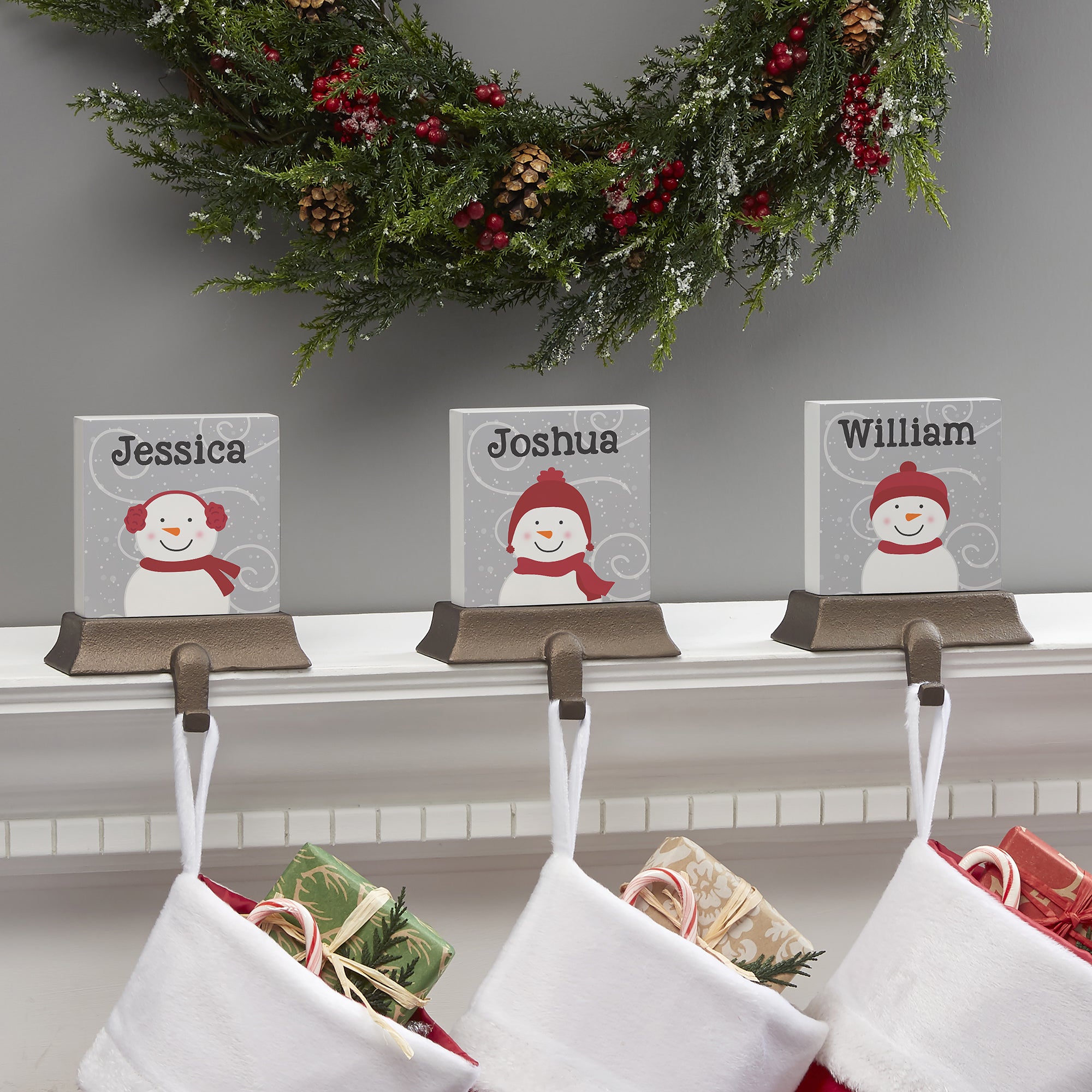 Festively decorate your fireplace mantel year after year with our Snowman Family Character Personalized Stocking Holder. Each stocking holder is heavy enough to support the most abundantly-filled stockings without nails or screws that could damage your mantel.