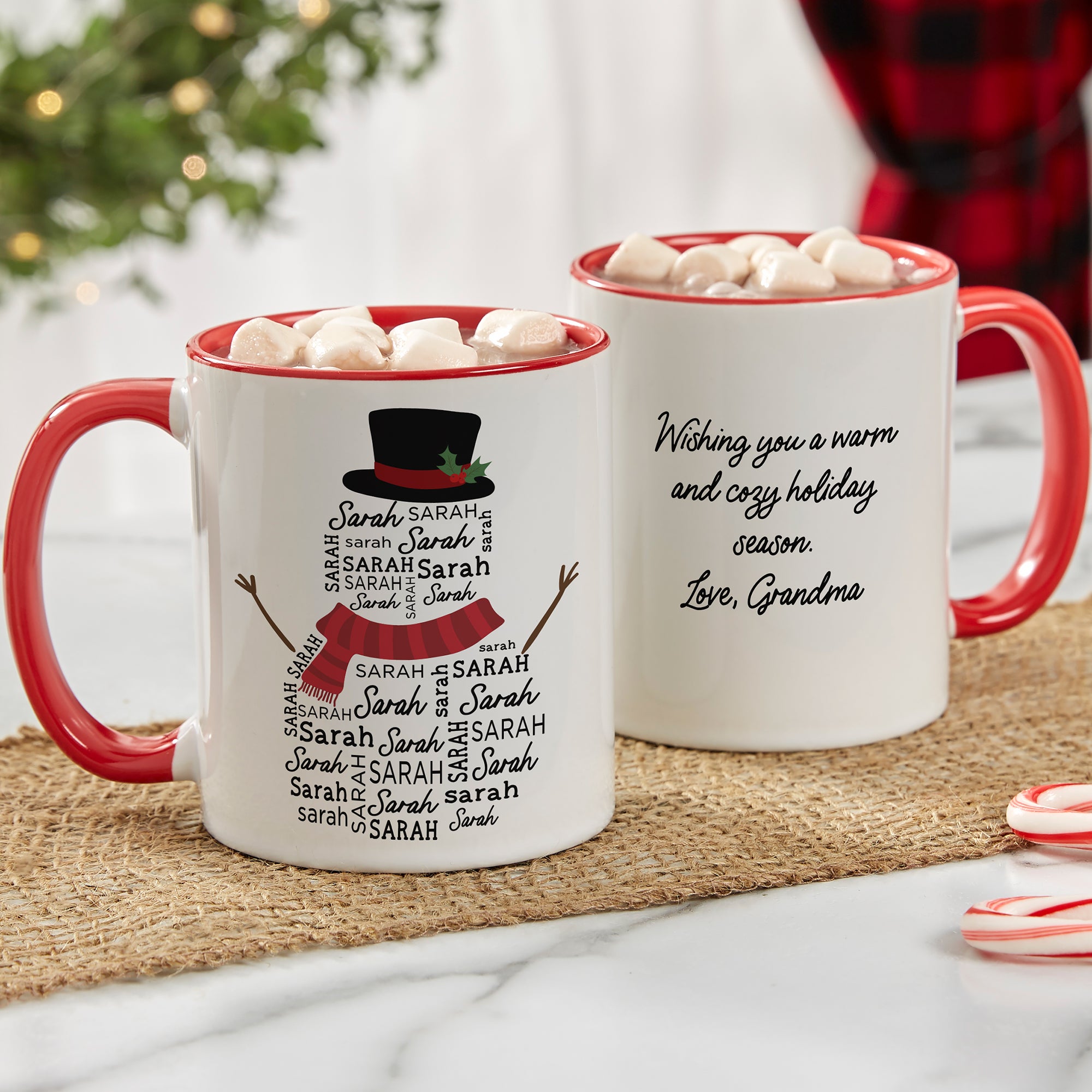 Enjoy some hot cocoa or any holiday beverage with the Snowman Repeating Name Personalized Coffee Mugs. The cute design makes it the perfect, classic holiday mug anyone will love.