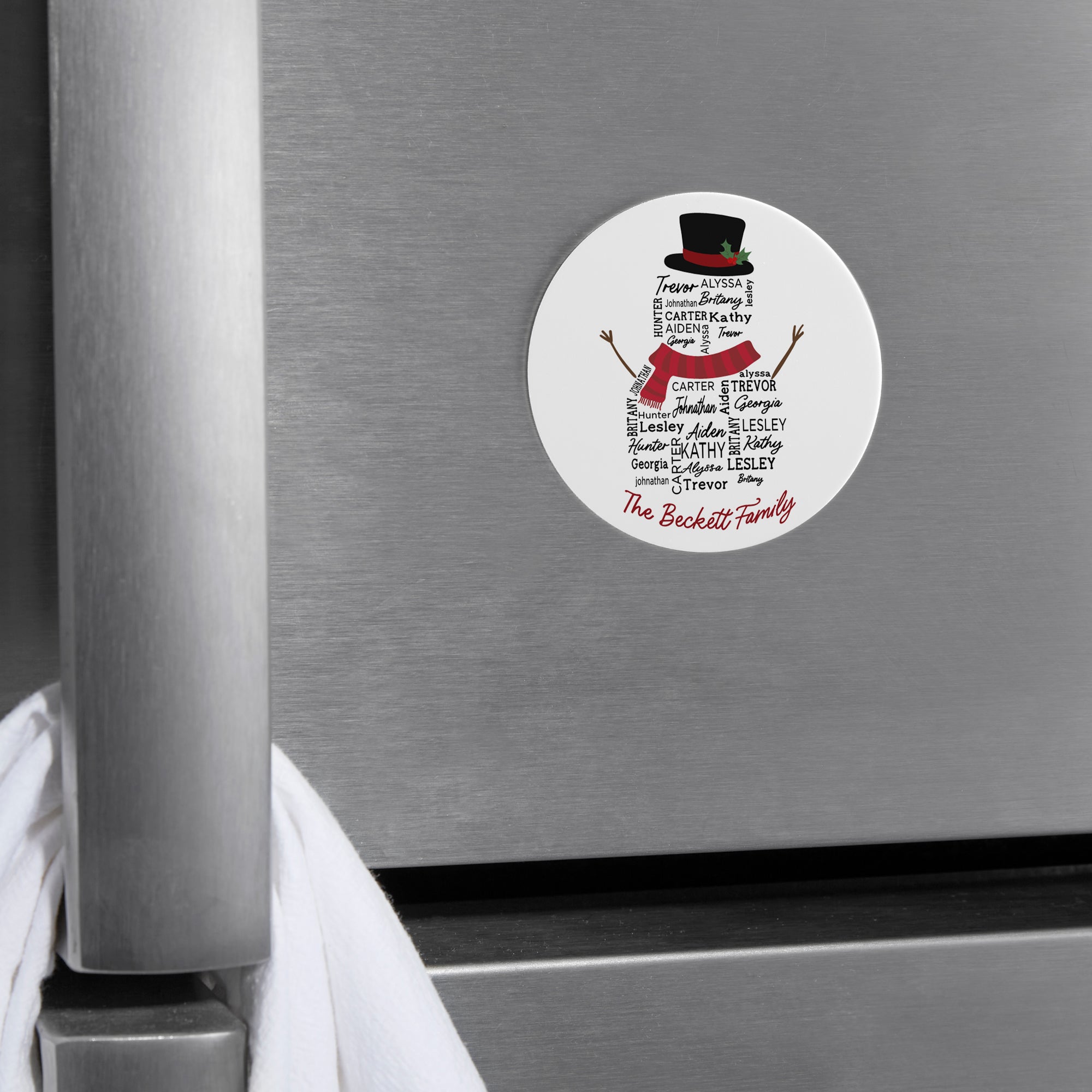 Add a personalized holiday touch to any fridge with our Snowman Repeating Name Personalized Metal Round Magnet.