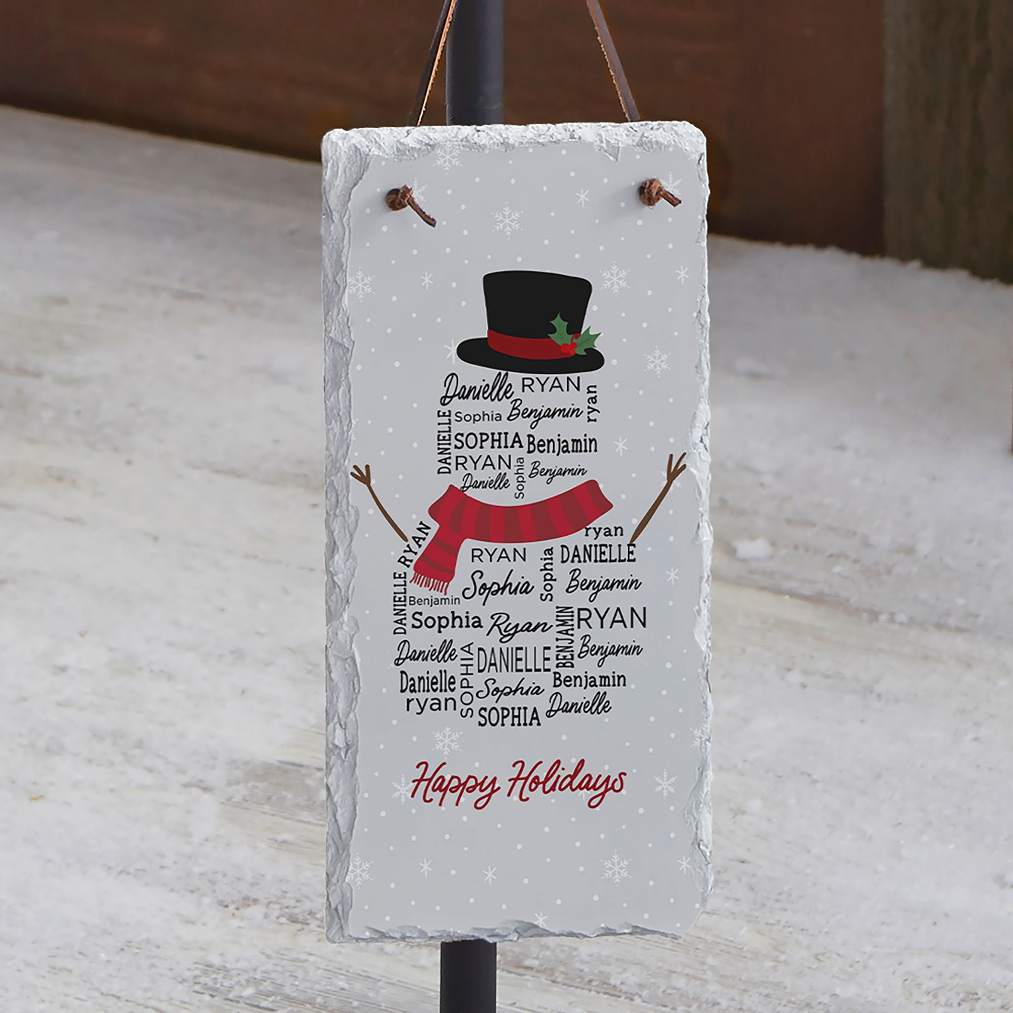 Welcome family and friends to your home this winter season with a beautifully crafted Snowman Repeating Name Personalized Slate Plaque.