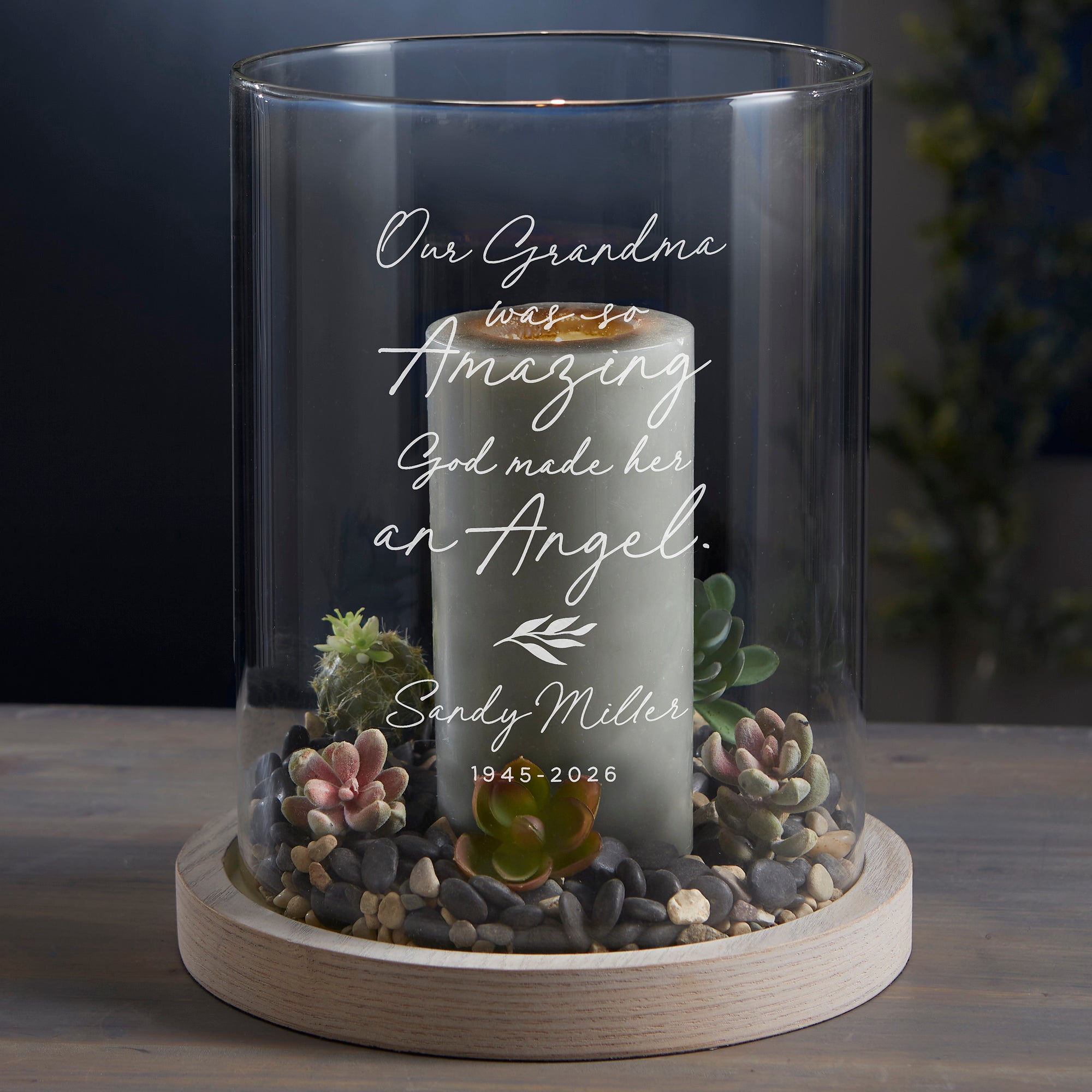Add a special piece of memorial home decor with the So Amazing God Made An Angel Personalized Wood Base Hurricane.