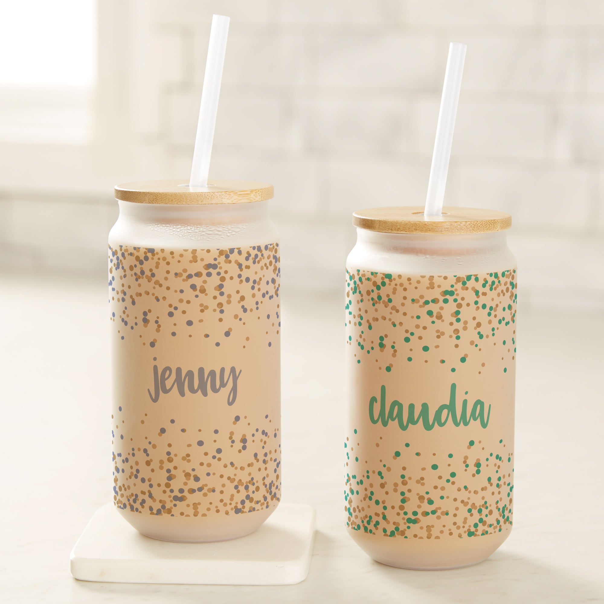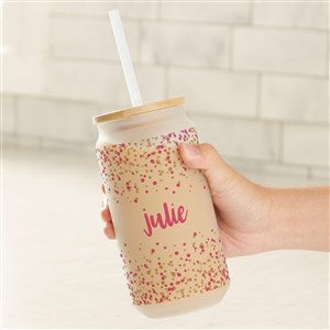 Sip in style with our Sparkling Name Personalized Frosted Iced Coffee Tumbler. A bamboo lid and straw add sustainable style and functionality, making this a perfect choice for travel drinkware and reducing spills in any environment! The bamboo lid fits perfectly on the glass and has a hole specifically built for the straw.