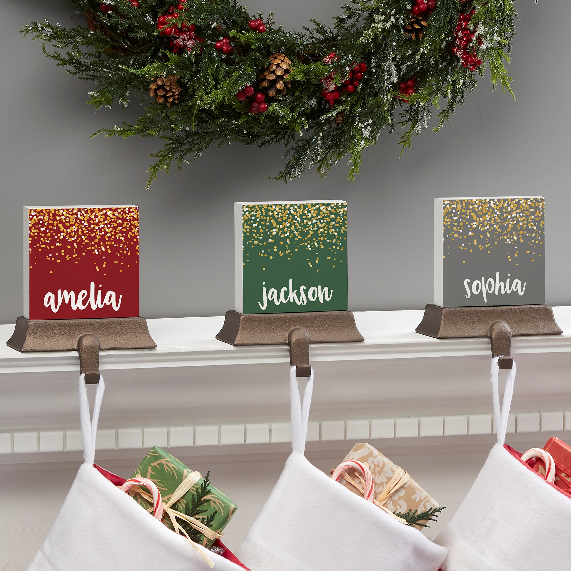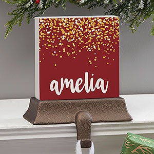 Festively decorate your fireplace mantel year after year with our Sparkling Name Personalized Stocking Holder. Each stocking holder is heavy enough to support the most abundantly-filled stockings without nails or screws that could damage your mantel.