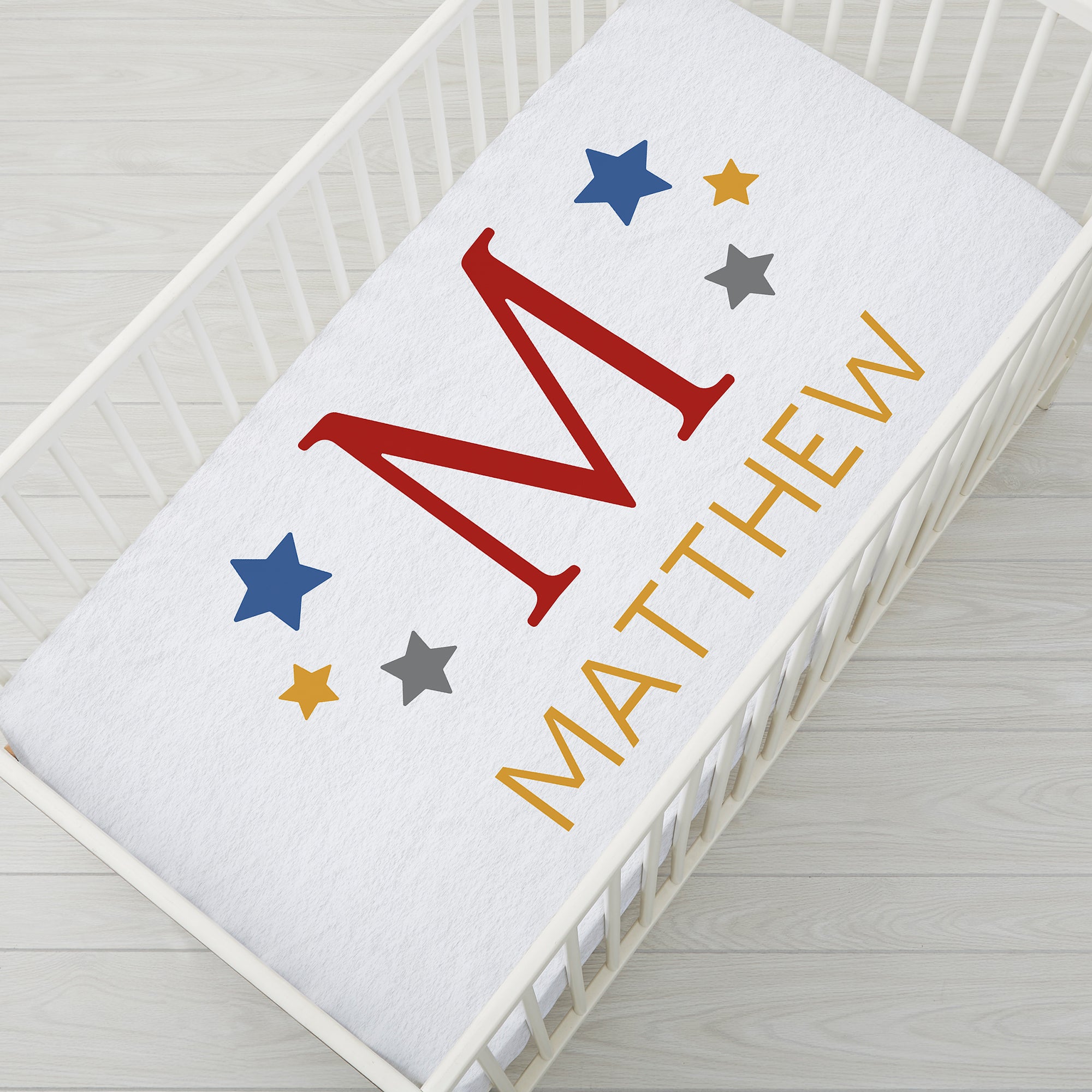 Our luxuriously, super soft Star Struck Baby Boy Personalized Crib Sheet adds baby's name to your nursery design.