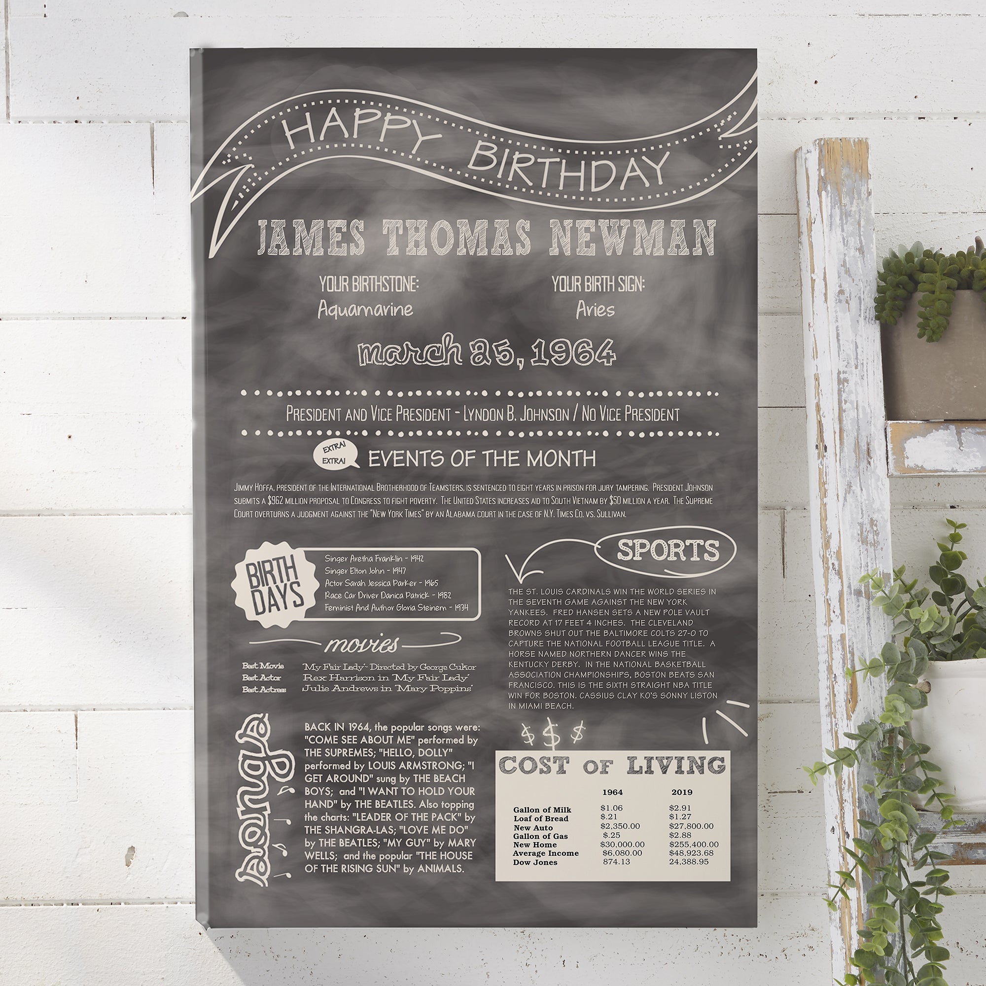 Our personalized chronicle canvas print is made especially for you and includes your birthstone and birth sign, President & Vice President at the time, headline news, along with the top movies, songs, and sports results. Also included are names of celebrities who share your birthday and cost of living comparisons The details are graphically created on our canvas print, and personalized with your full name and birth date, as shown.