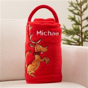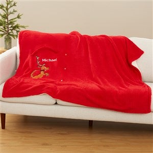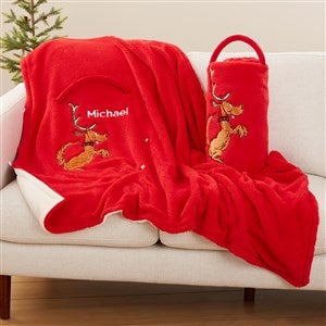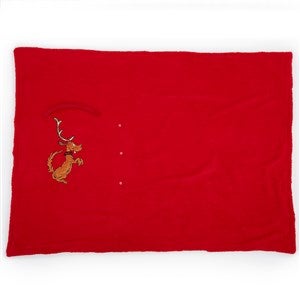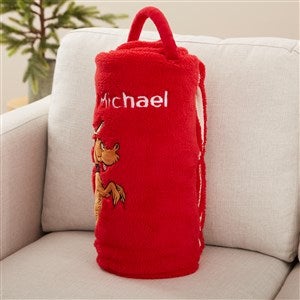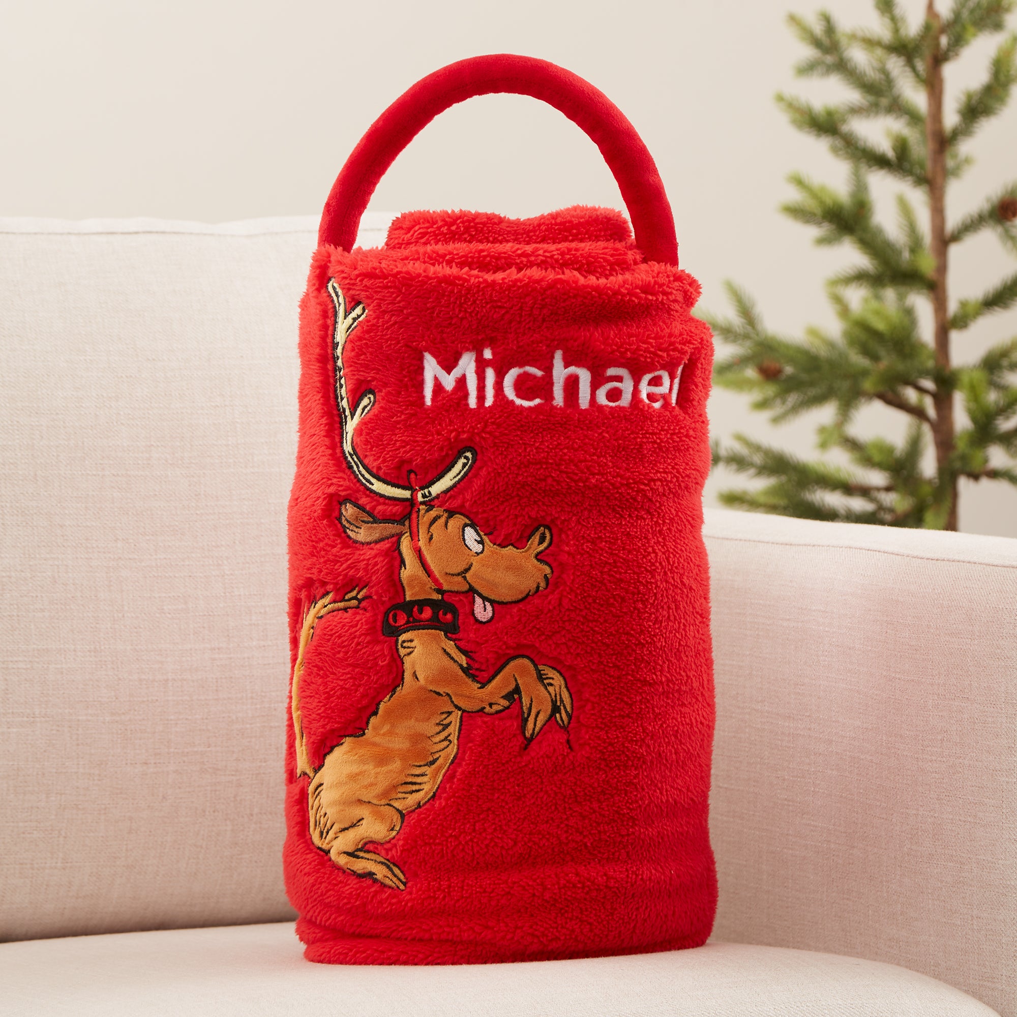 Celebrate the season cuddled up in The Grinch Max Personalized Fleece Blanket. The festive design will add a pop of holiday spirit to any sofa, chair or bed. When not in use roll the blanket up showcasing Max making it a great holiday décor piece.