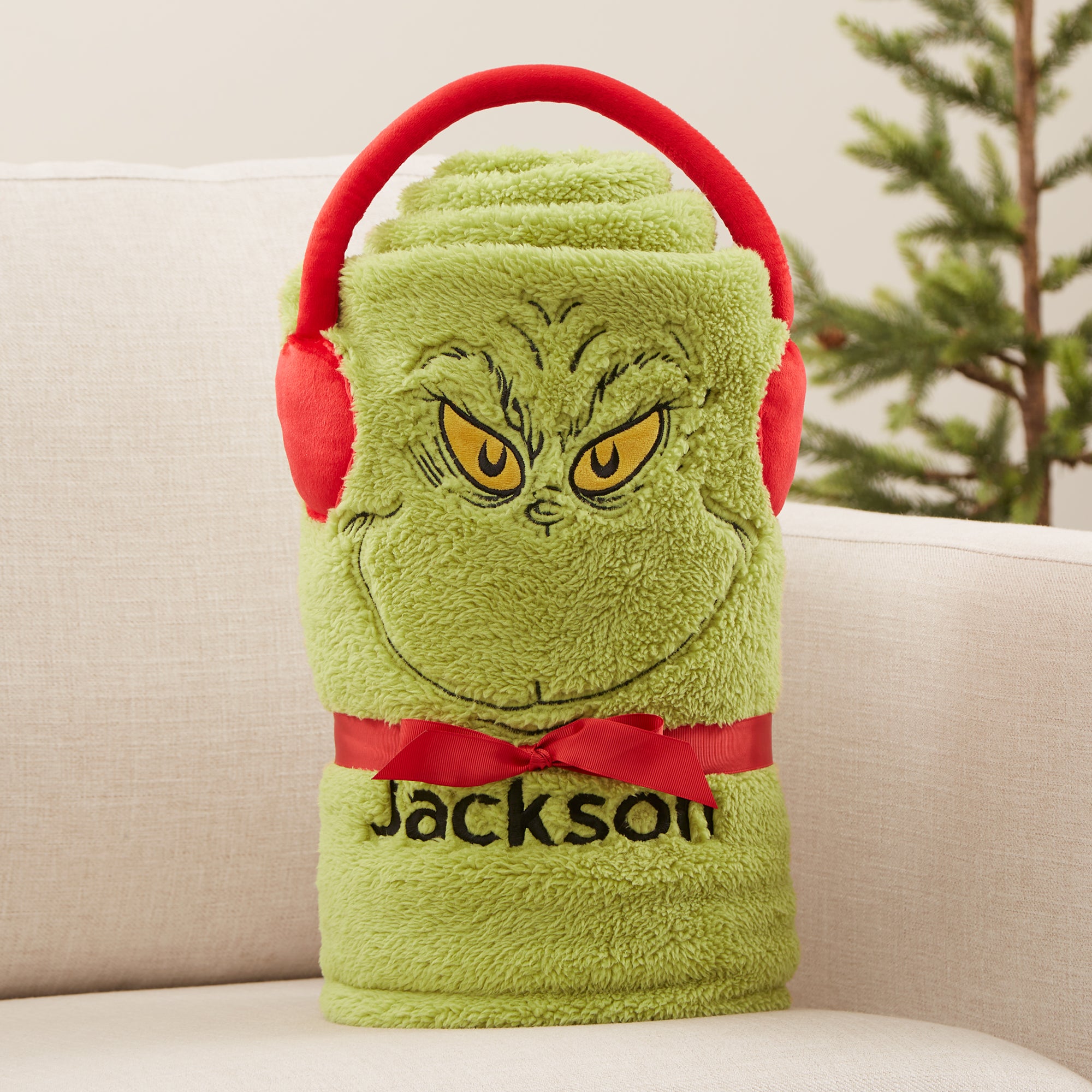 • The blanket looks like The Grinch when rolled up with embroidered facial features