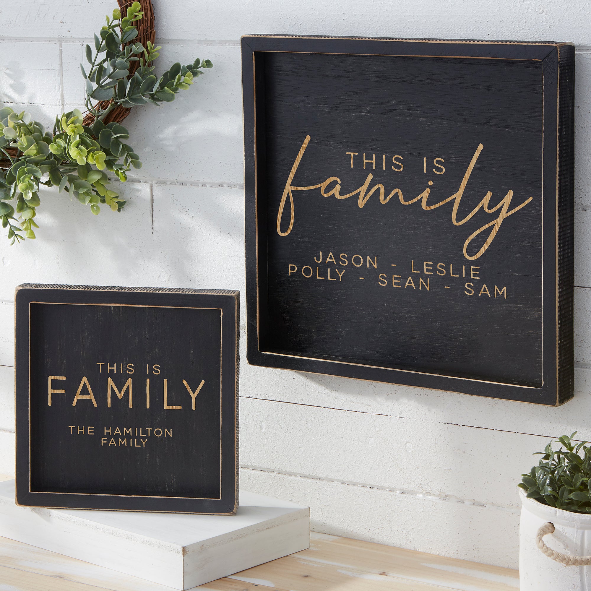 The This Is Family Personalized Distressed Black Wood Sign will add a dramatic accent to any room in the home. The laser engraved black wood is framed with a distressed edged wood frame. Can hang on the wall or stand on a shelf.