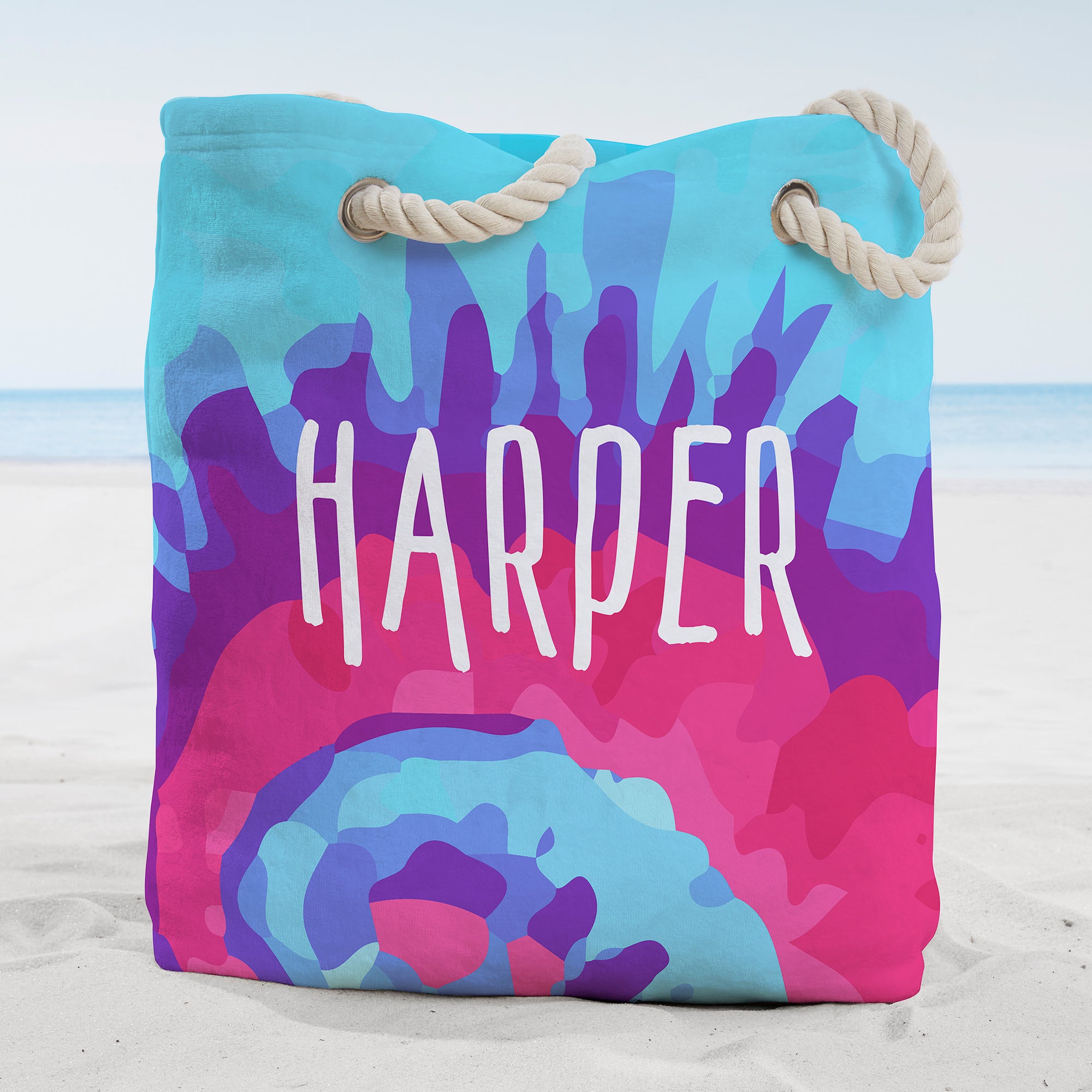 The Tie-Dye Fun Personalized Terry Cloth Beach Bag is the perfect way to tote your towels, sunblock and beach supplies to the beach or the pool.