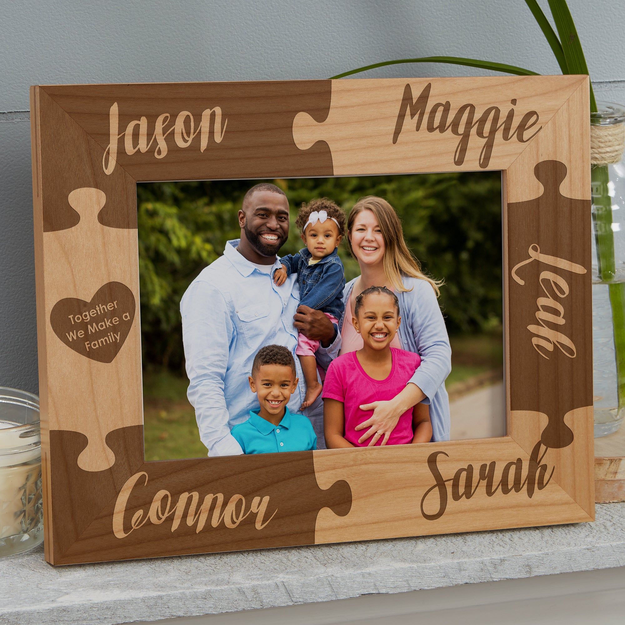 This elegant picture frame will creatively incorporate up to 8 first names within our puzzle piece design. We will then include, "Together We Make A Family," engraved in a lovely heart.