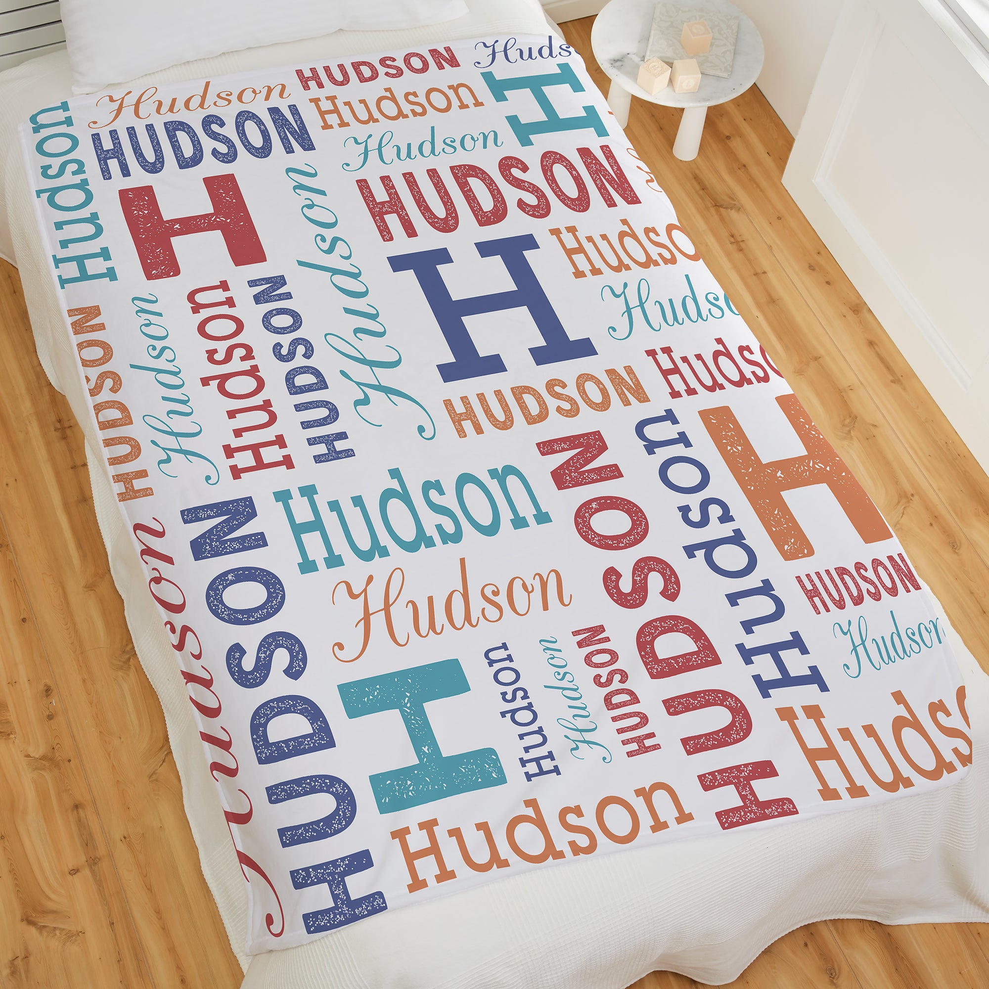 The Trendy Repeating Name Personalized Blanket features a colorful design with their name repeated throughout the blanket in fun way.