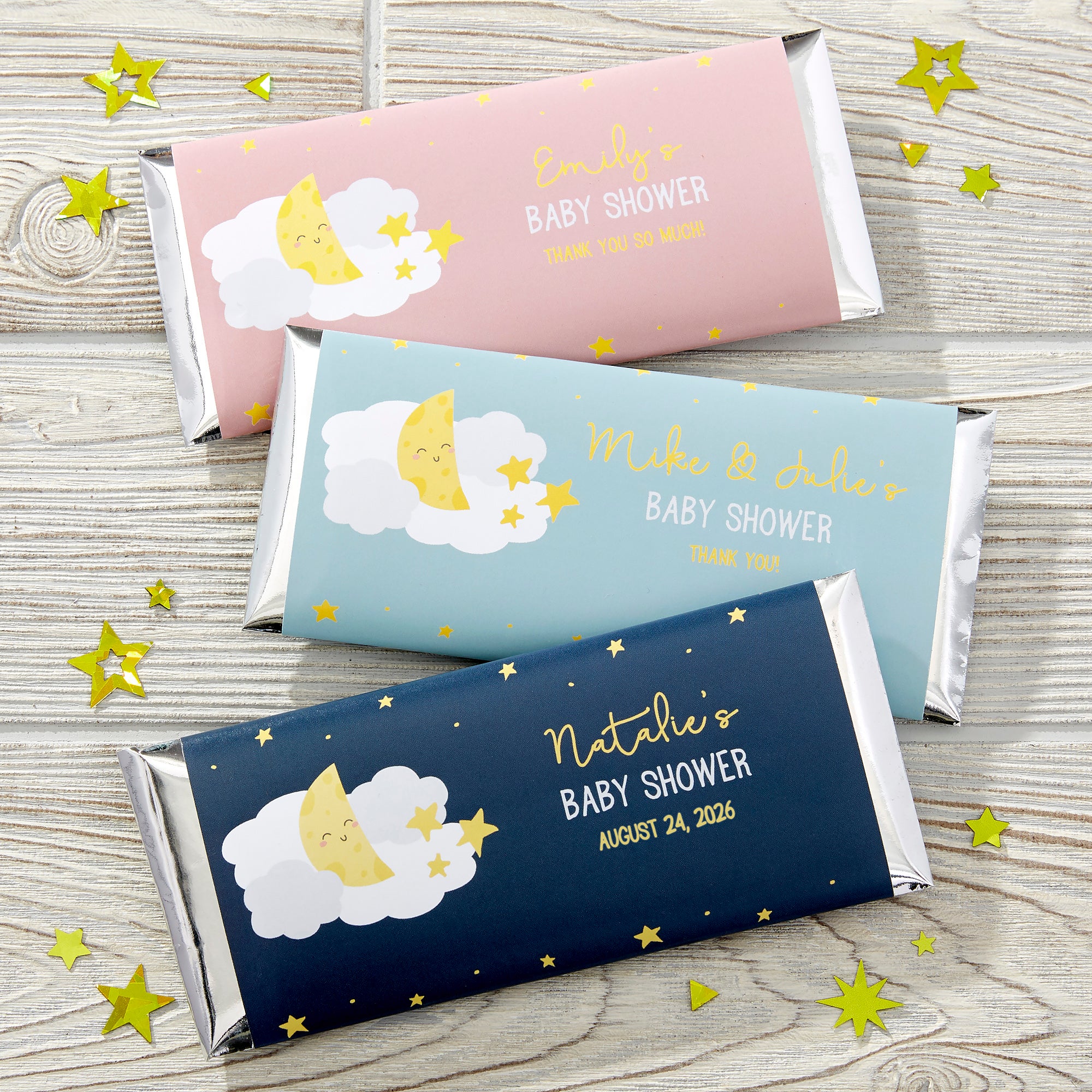 Thank your guests in a sweet way with our Twinkle,Twinkle Personalized Candy Bar Wrappers! These wrappers fit around standard sized candy bars, creating a unique favor gift to thank guests for attending your baby shower.