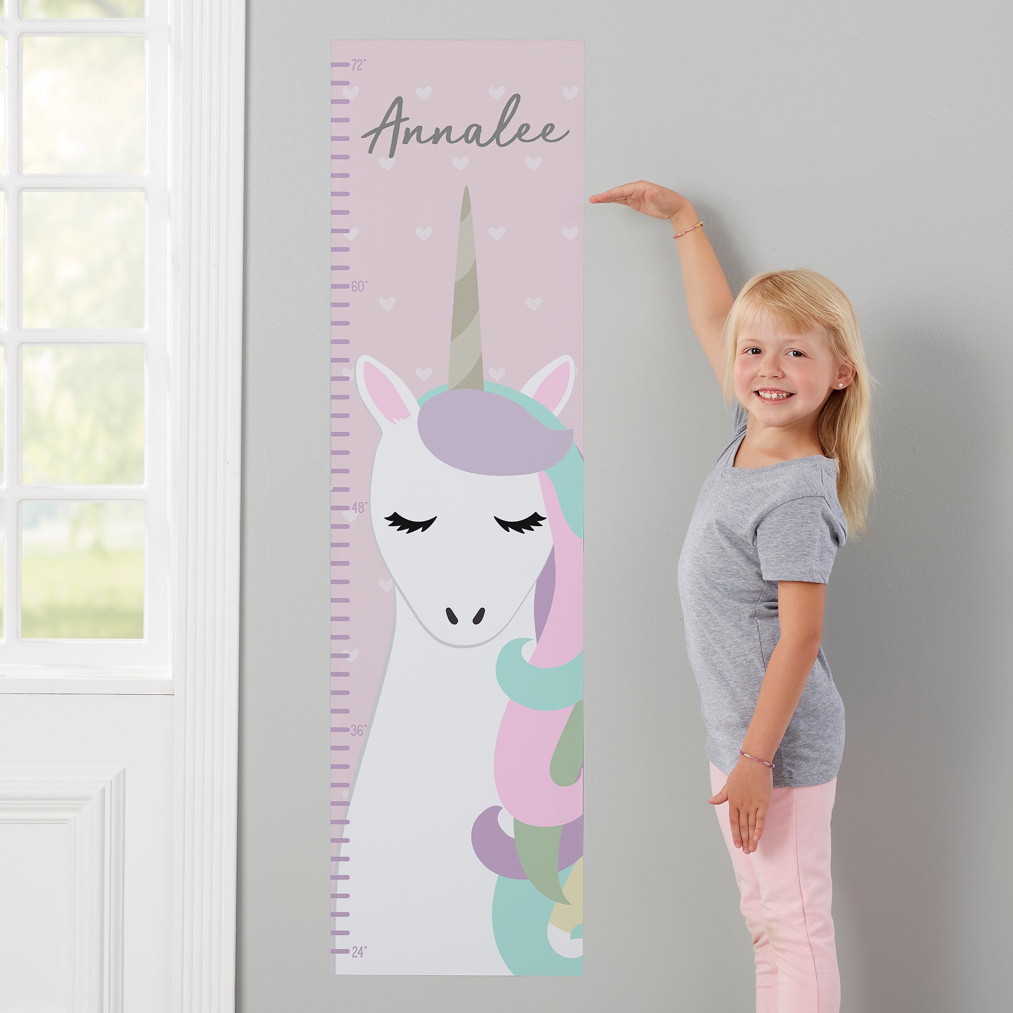They grow up so fast, keep track with the Unicorn Personalized Wall Decal Growth Chart. This removable wall decal can be hung anywhere in the house and be marked with a permanent marker (not included).