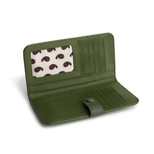 - Interior features 15 card slip pockets, an ID Window and two bill slip pockets