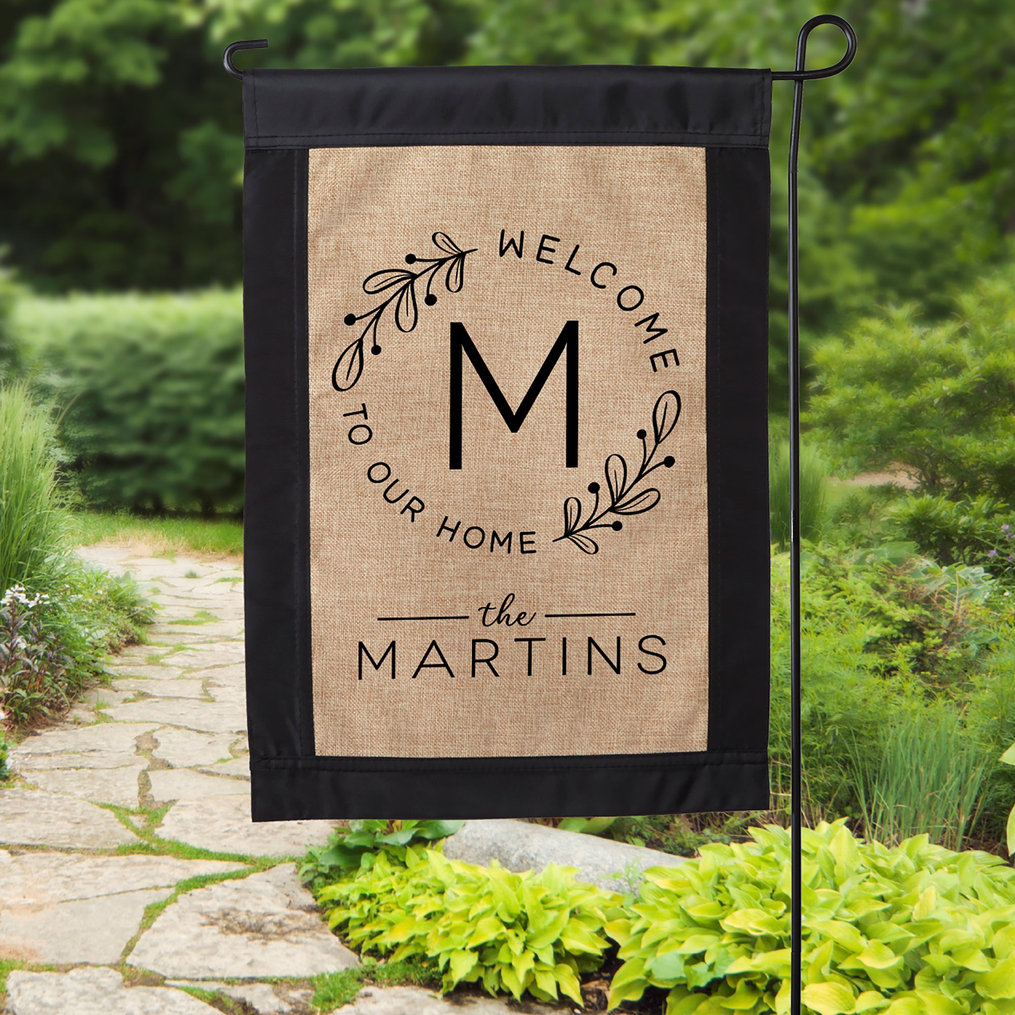 Add a unique, distinctive finish to your front yard or garden with our Welcome Wreath Personalized Burlap Garden Flag!