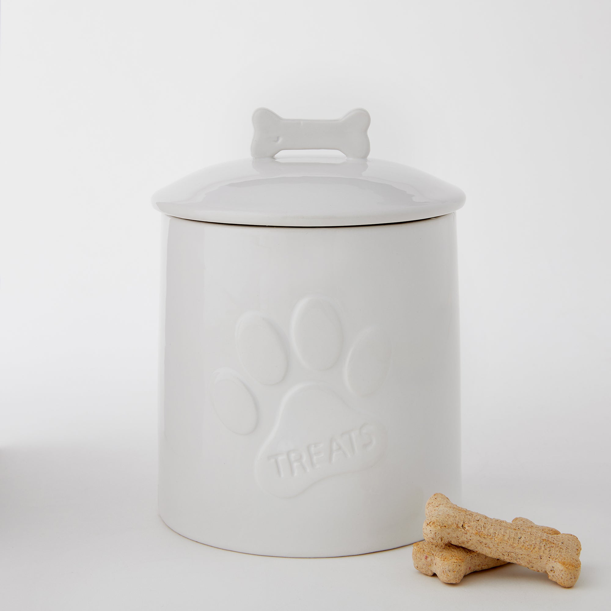 - White ceramic treat canister that reads "Treats" written across the paw print on the front of the jar and a bone-shaped handle on the lid