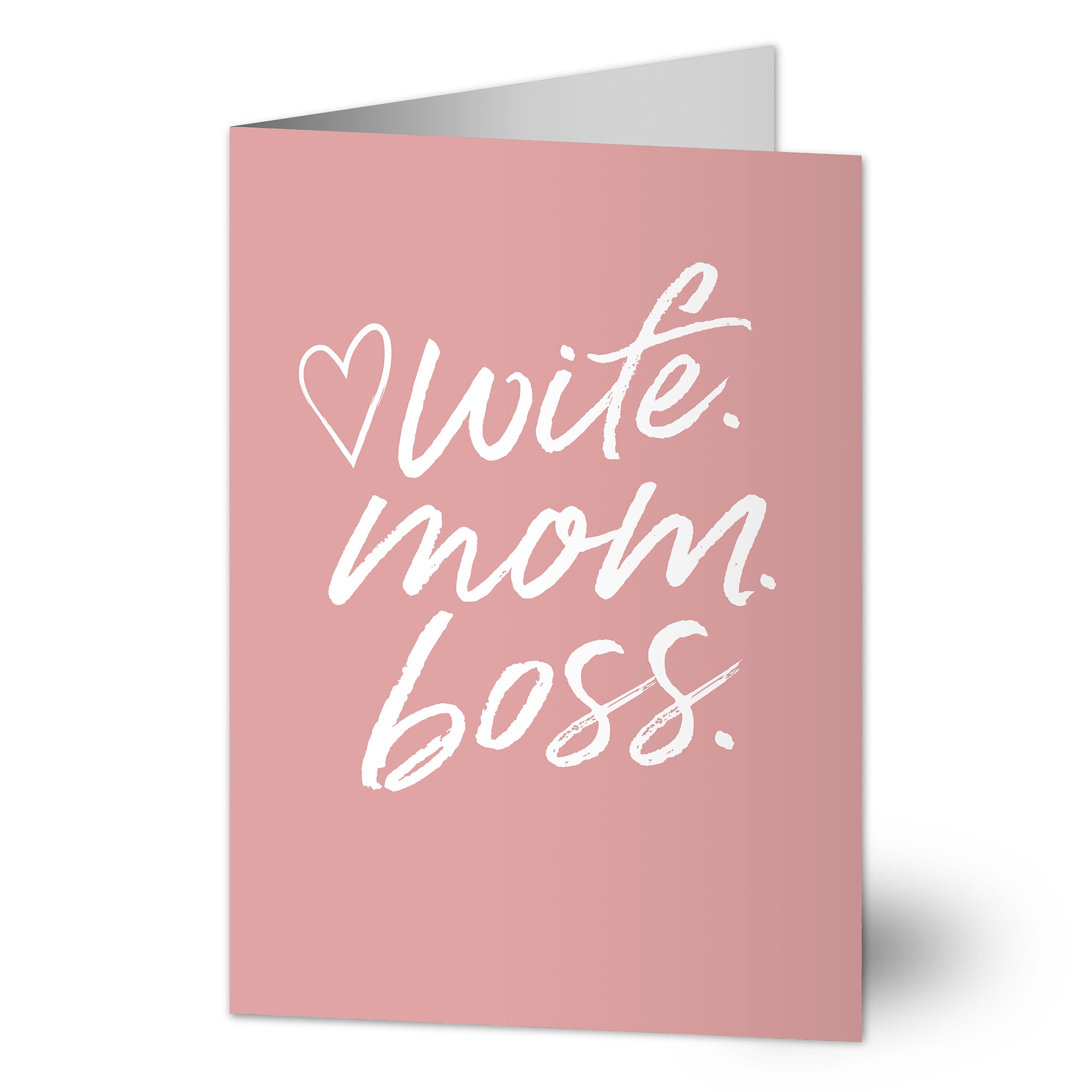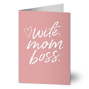 Let your mom know how much she is loved with our Wife. Mom. Boss. Personalized Greeting Card. Available in both signature and premium finishes, this card is the perfect finishing touch for any Mother's Day gift.