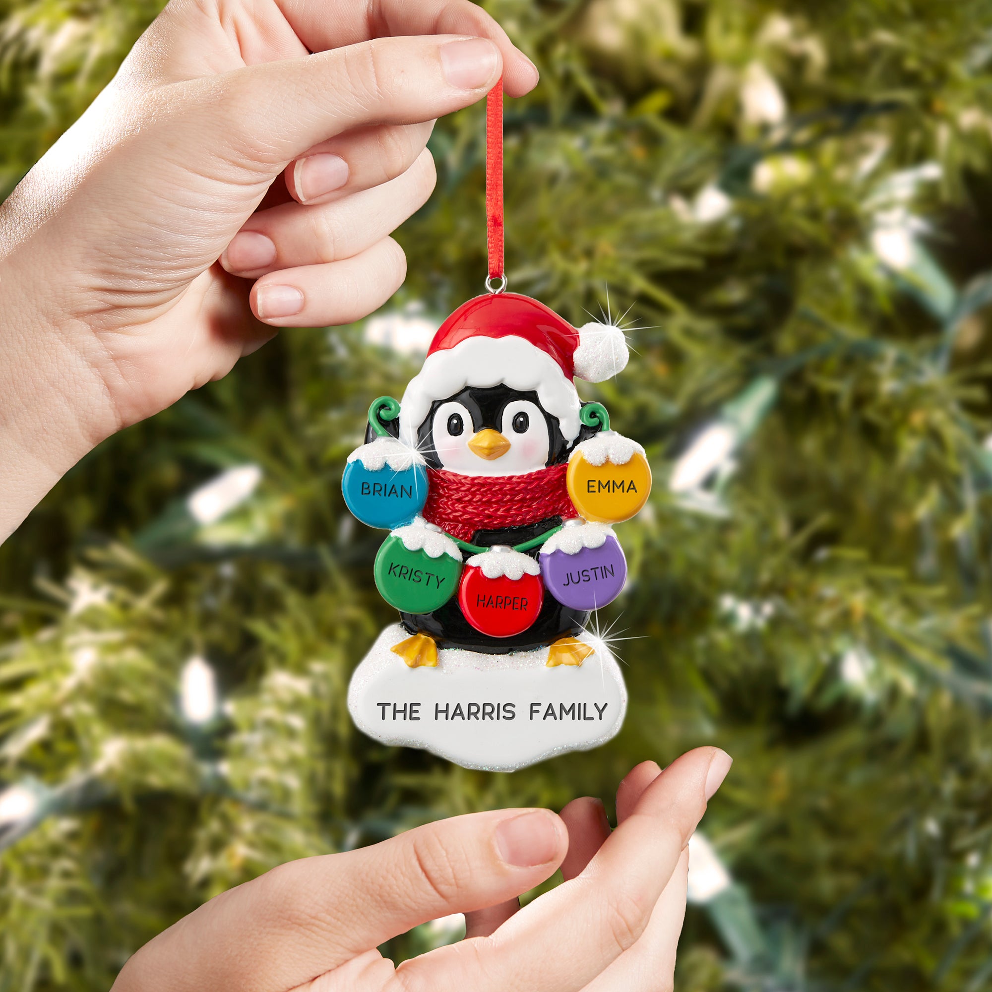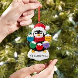Our adorable, Winter Penguin Personalized Ornament will make a great addition to their tree this holiday! The cute penguin is holding a string of ornaments that displays each family members name or loving words.