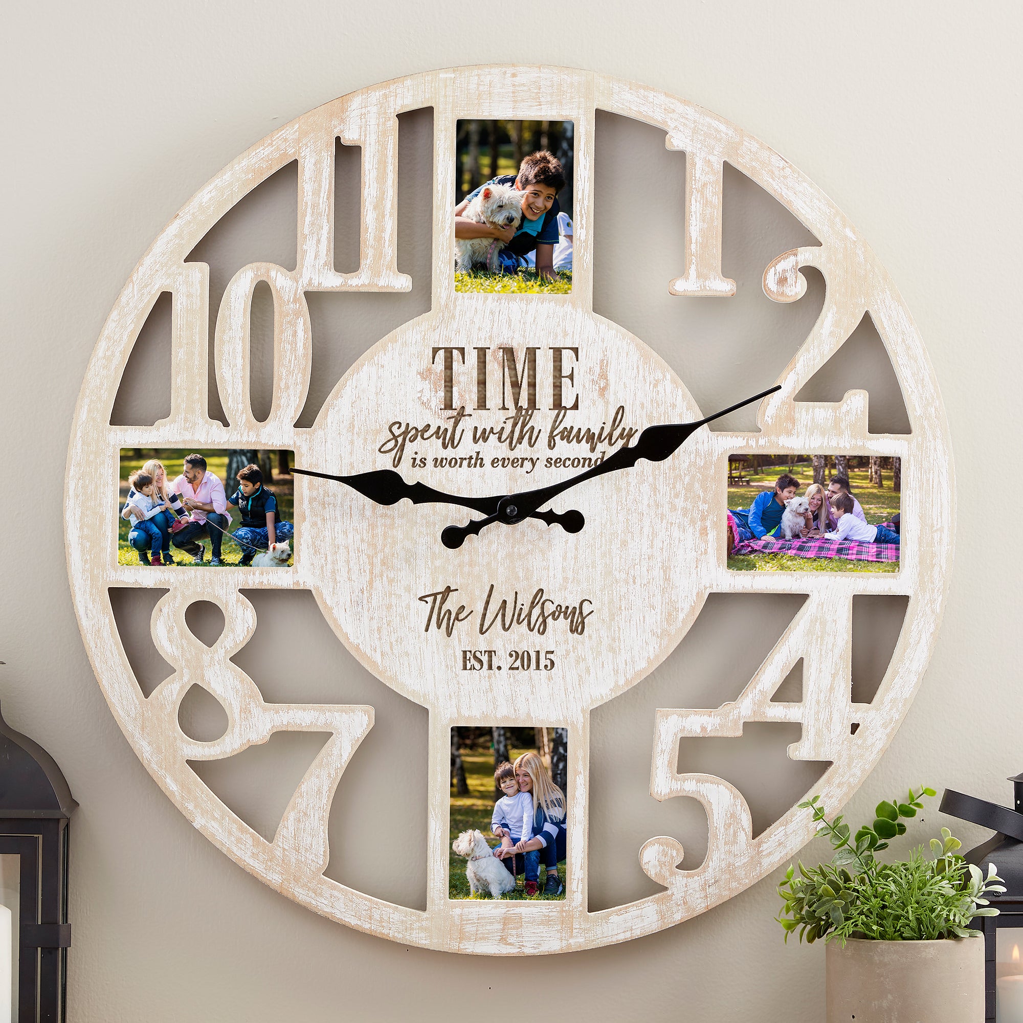 The Worth Every Second Personalized Picture Frame Wall Clock makes a unique gift for any member of the family. Adding your own favorite pictures gives each clock its own personal style.