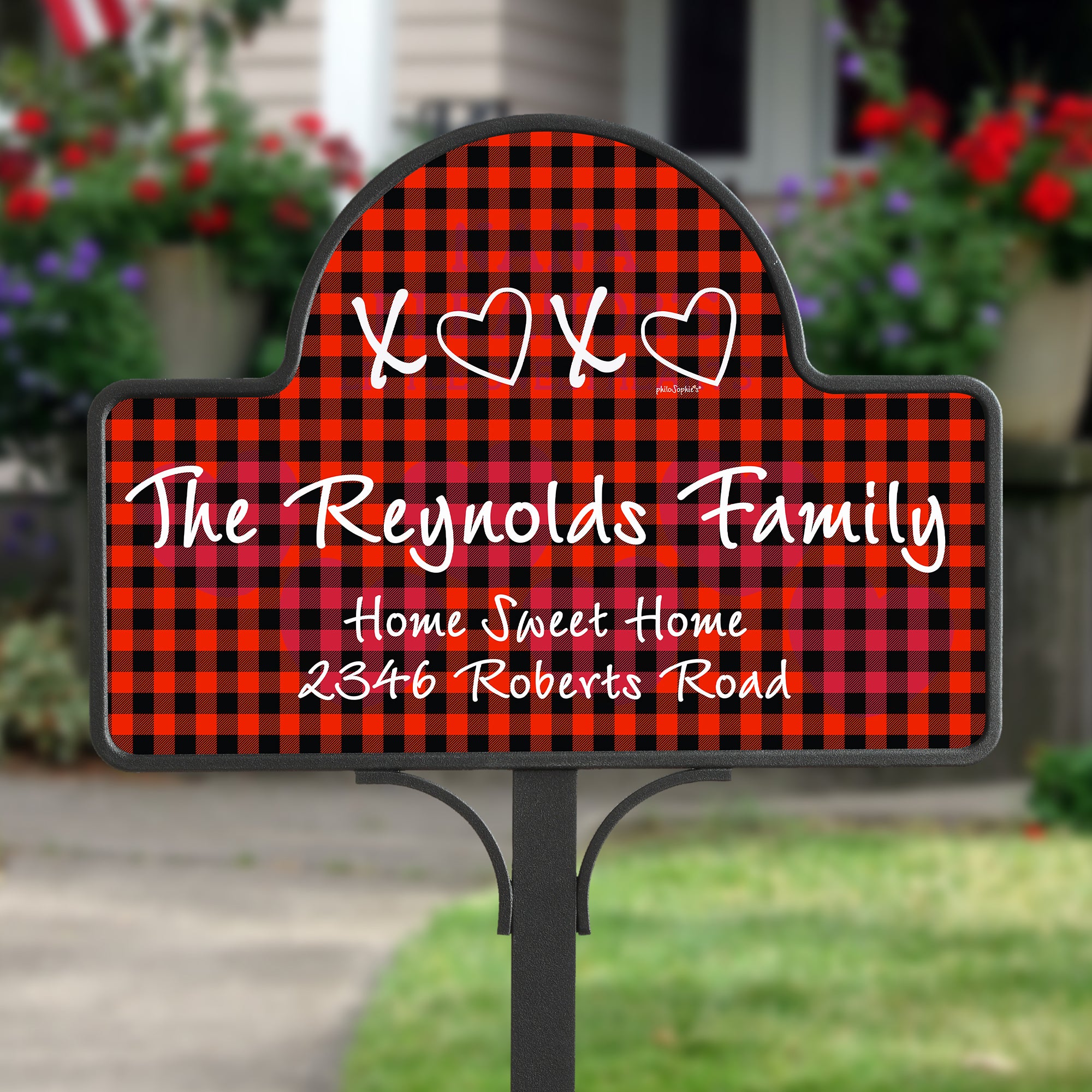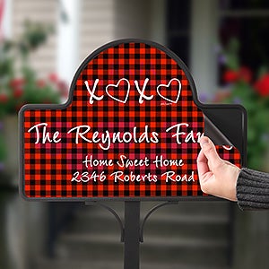 Decorate your garden or walkway in festive style this holiday season with our exclusive philoSophie's® XoXo Red & Black Buffalo Check Personalized Magnetic Garden Sign.