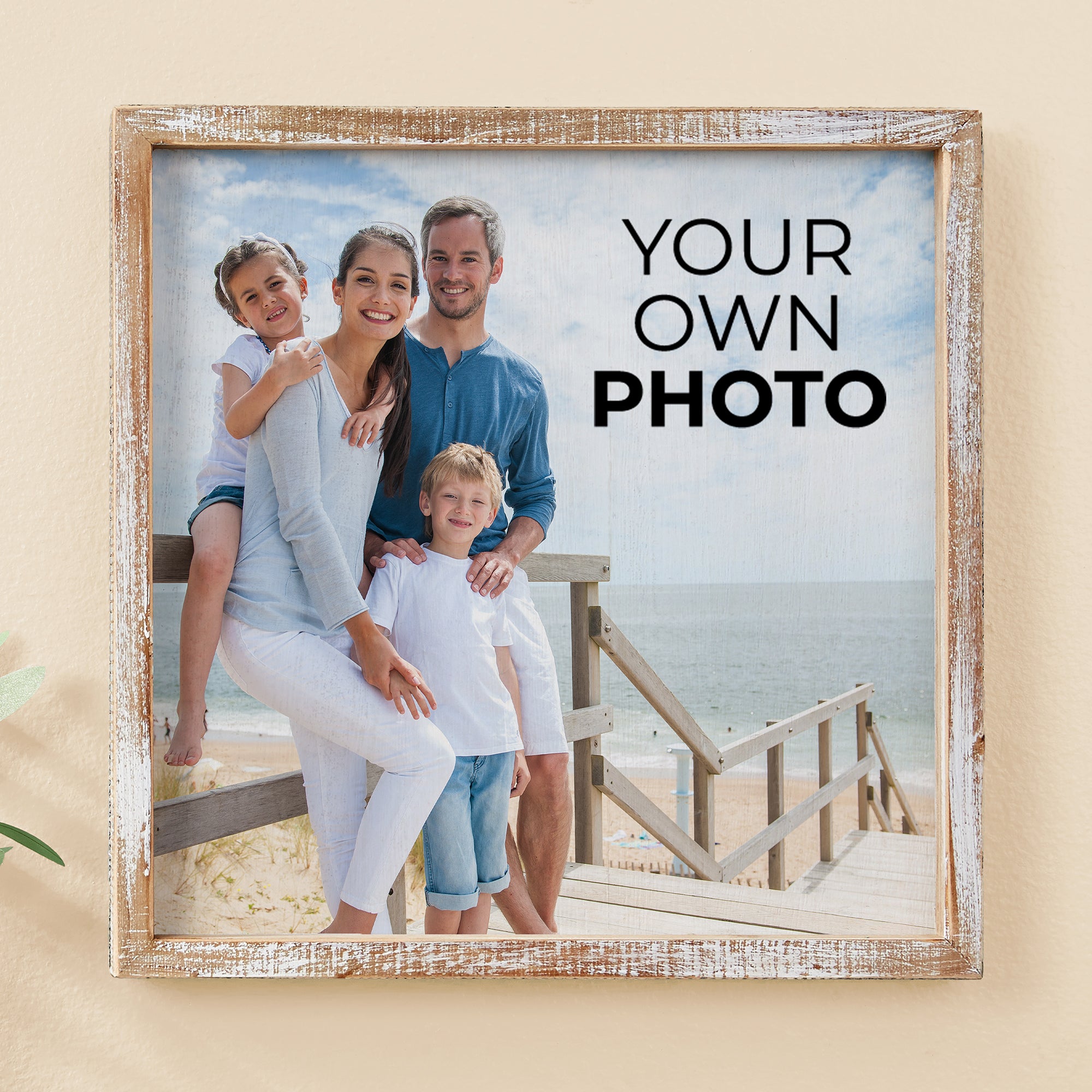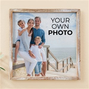 - Upload any favorite photo to be printed on the center wood surrounded by a whitewashed wood frame