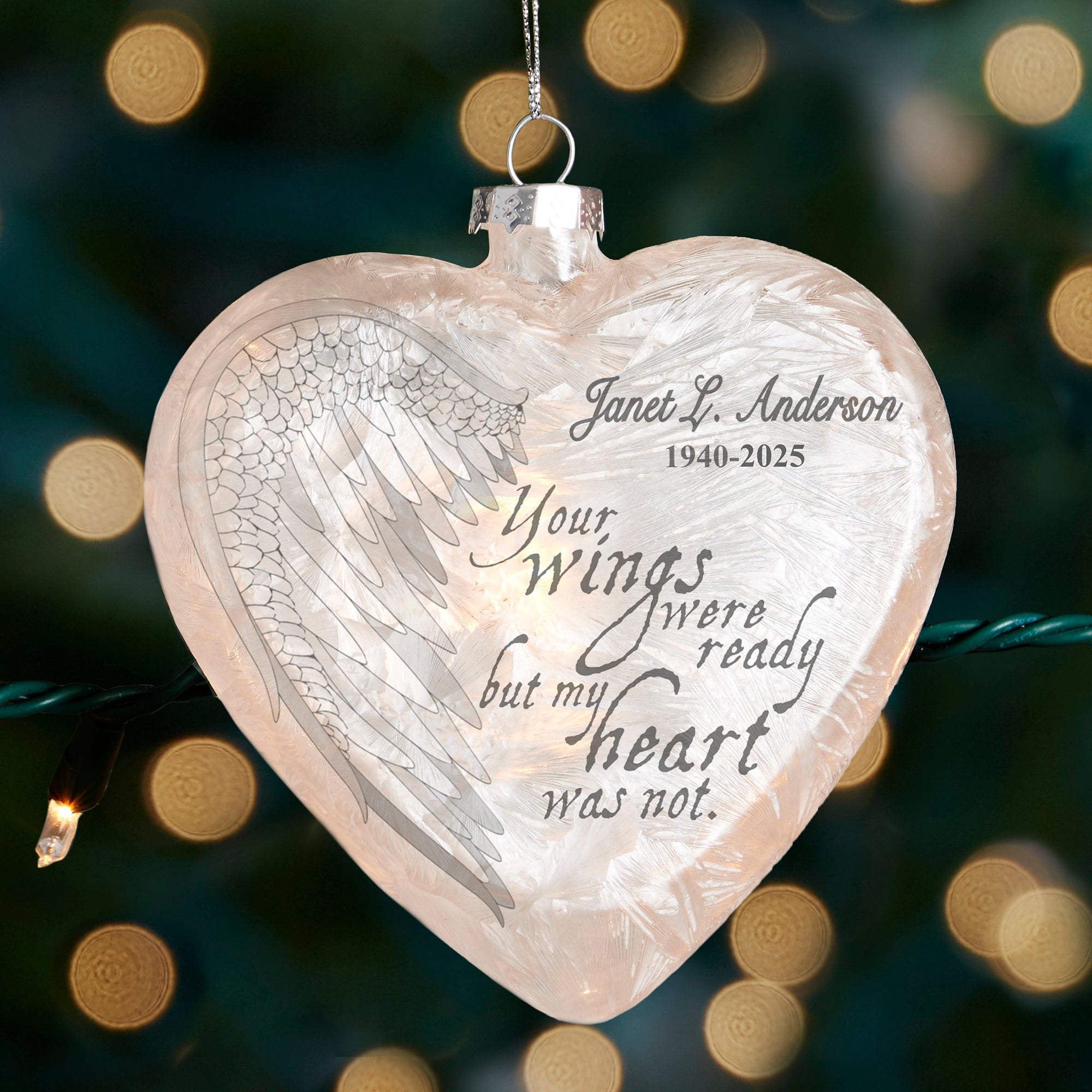 The Your Wings Personalized Memorial Lightable Frosted Glass Heart Ornament is a sentimental way to display and honor the ones you loved. Insert any small bulb Christmas tree light in the back and watch your ornament light up. Whether you use clear or multi-colored lights, your ornament will give a glow whenever your lights are on.