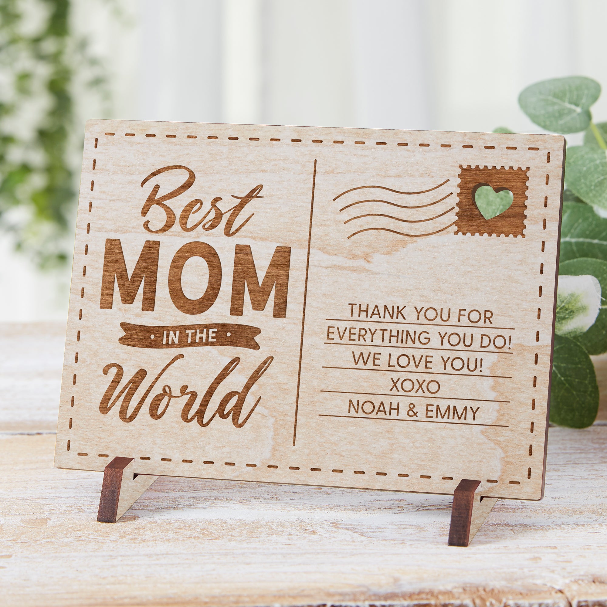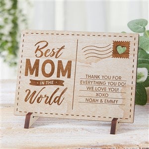 Send her a special delivery with our Best Mom In The World Personalized Wood Postcard. Makes a wonderful keepsake gift for Mother's Day, Birthday, and many more occasions!