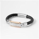 He will love wearing the Engraved Black Leather with Rose Gold Accent ID Bracelet.! The hint of rose gold really makes this piece stand out alongside the silver toned stainless steel and genuine leather band. This is a piece that can be worn for special occasions or every day! Engrave the ID bar with his name, birthdate, or a short note.