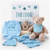 Welcome him into the world with our adorable Hi Little One Personalized Baby Boy Gift Set designed to delight both baby and parents alike. This charming set includes a receiving blanket, baby gown & hat, plush teddy bear with matching bib and bear rattle.