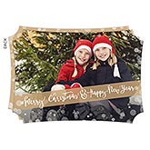 Photo Christmas cards Cards are nice however I didn’t realize that the placing of the merry christens / happy new year banner on the front of the card would cover as much of the photograph as it does , I had a church printed and the front of the building is hidden behind the banner . Please take into consideration when selecting your photograph .