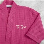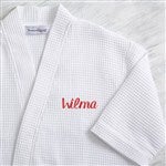 Embroidered Waffle Weave Kimono Robe (White)I ordered the White Embroidered Waffle Weave Kimono Robe for my daughter-in-laws birthday and she loved it! I had her name embroidered in a burgundy color so it would stand out against the white robe. I believe this added a very special touch to her gift. The price was very reasonable plus the free embroidery made it a wonderful & personal gift. Thank you for helping make her birthday gift a special one. I will definitely consider this robe as a gift for my daughters and/or sisters in the near future. Wonderful item!