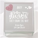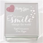 Perfect giftThe glass music box was a perfect gift for my granddaughter's First Communion. My inscription made it very personal and she immediately put the several pieces of jewelry she received on the special day in it. I'm sure she will cherish it her entire life. I was also impressed with the quality of the box and the two day delivery complete with the personalized inscription.