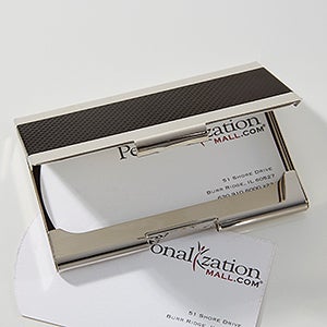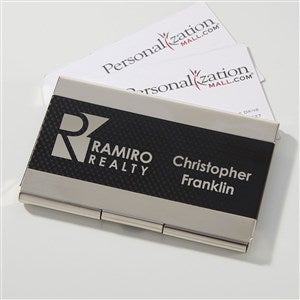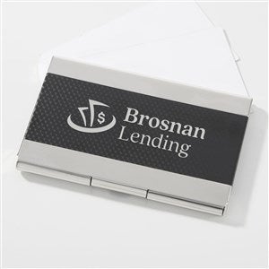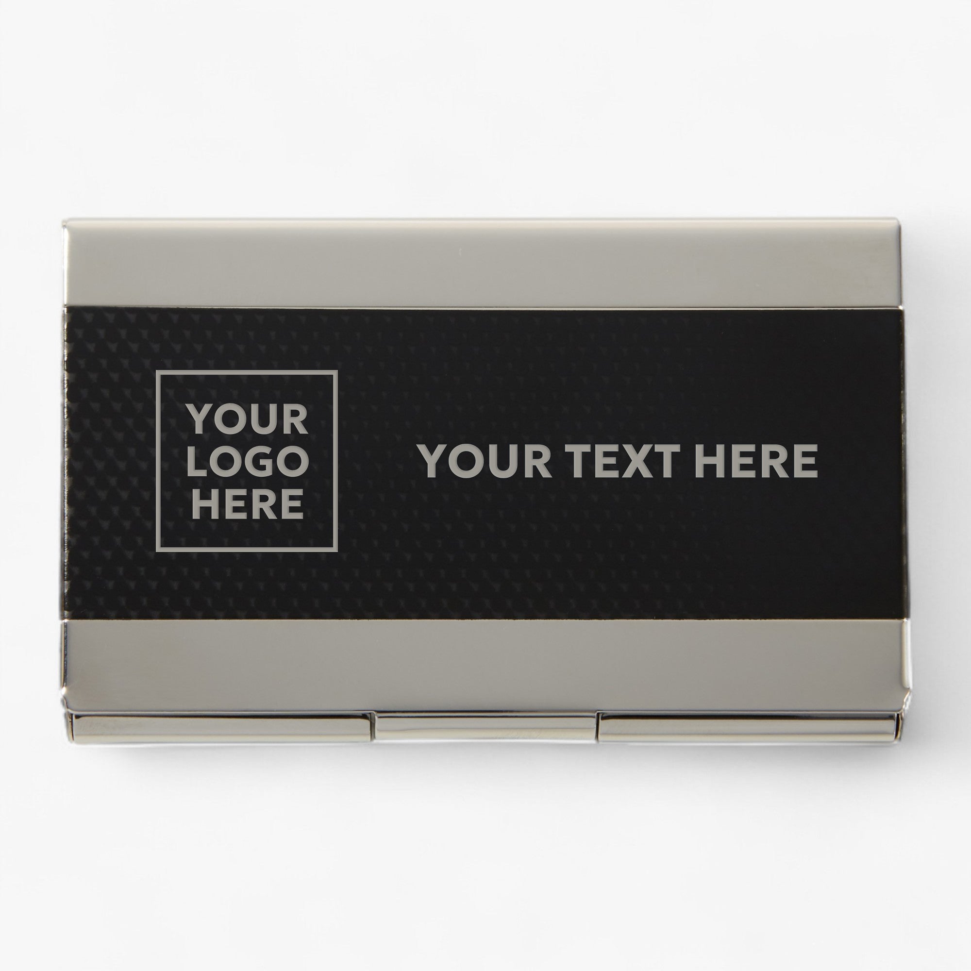Our Black & Silver Logo Business Card Case is quality constructed and sculpted with a handsome two-toned cover and hinged lid to hold ample business cards or credit cards.