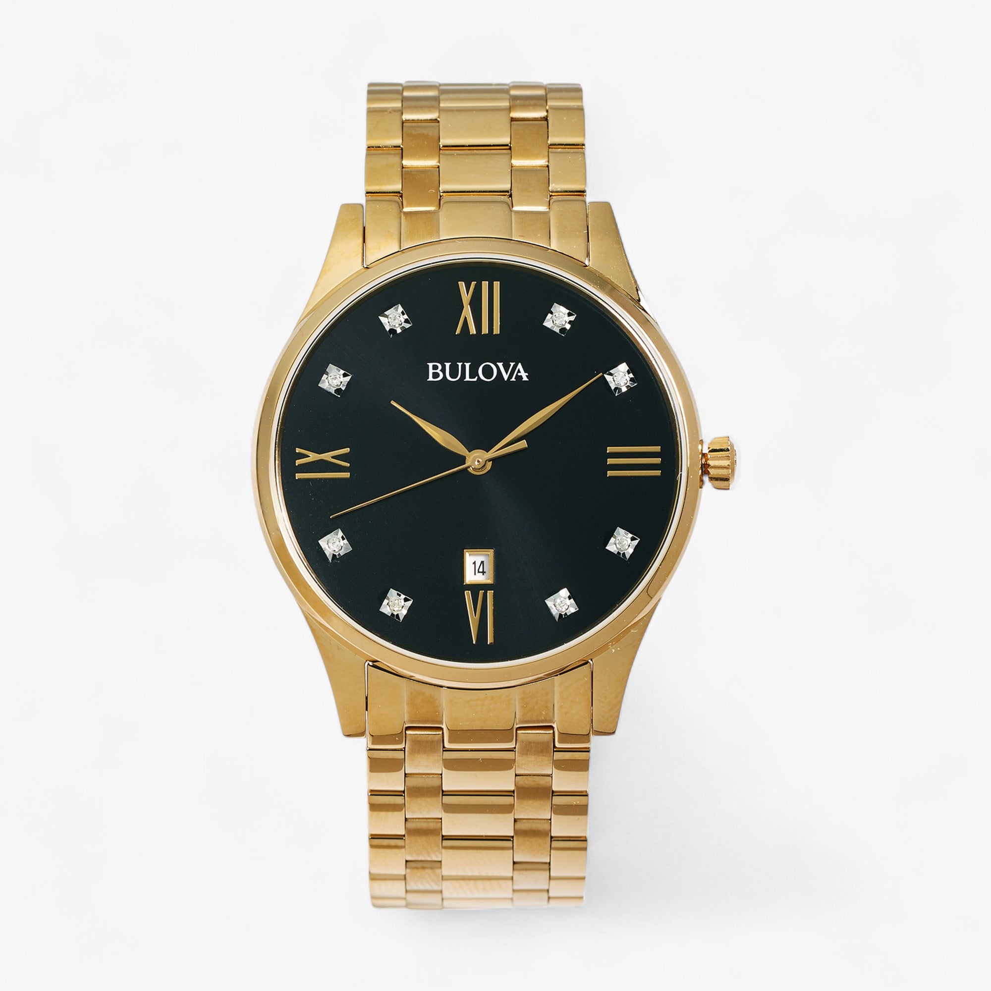 - 8 diamonds at hour marking on the black watch face with three gold-tone hands, displays date