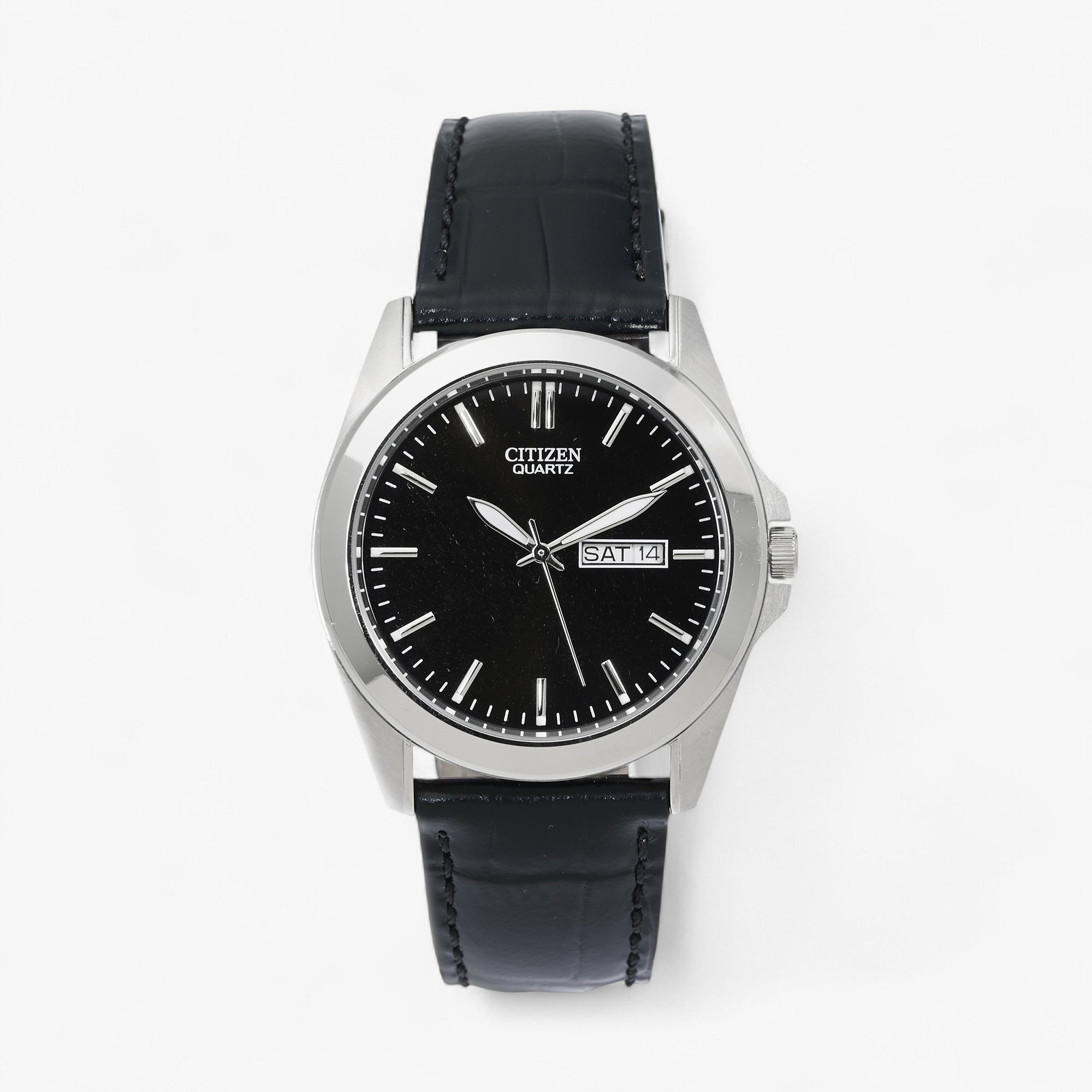 - Citizen Quartz watch with stainless steel case and black textured leather strap