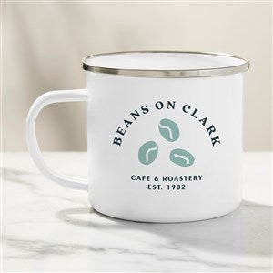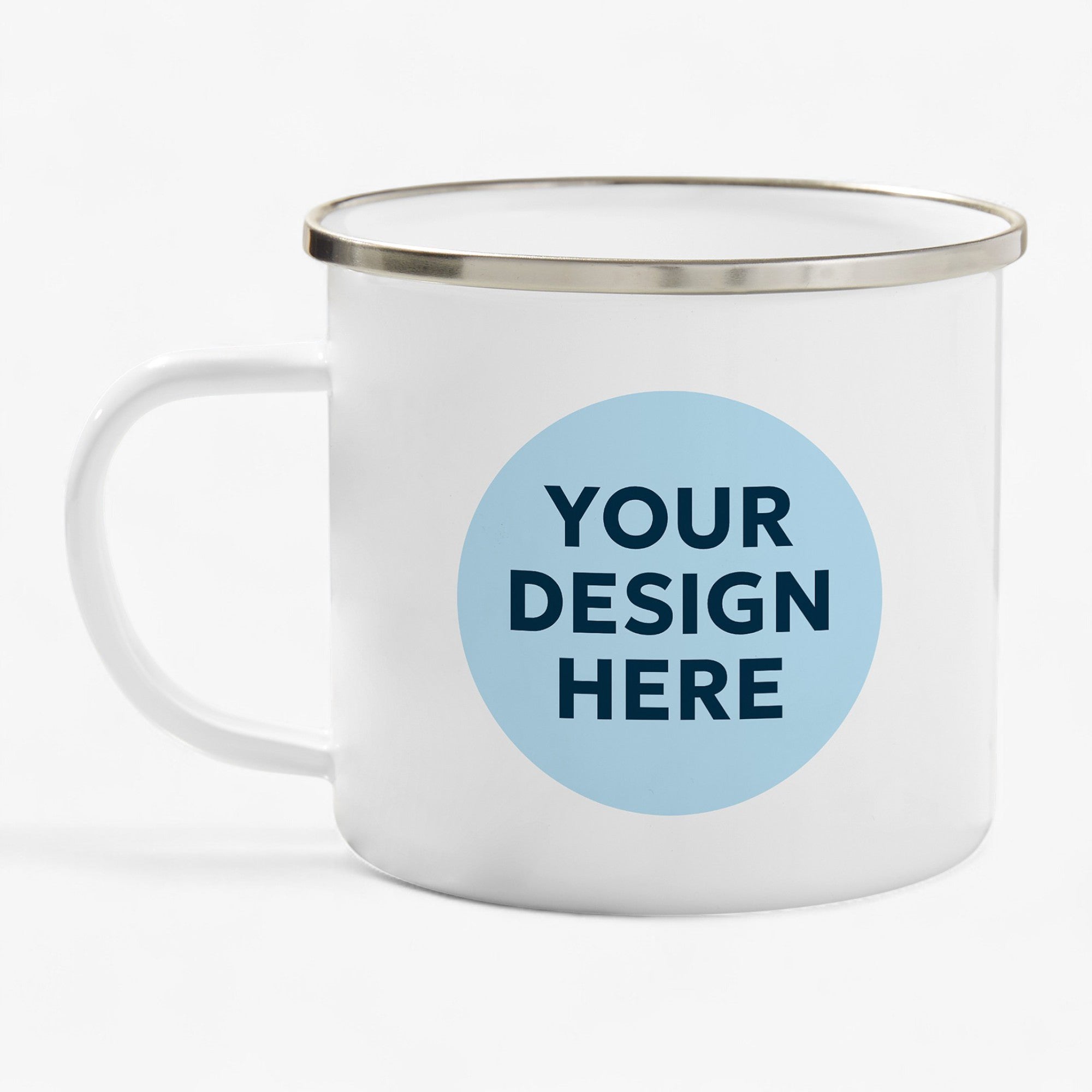 Our large Personal Logo Enamel Mug 18 oz can be customized with any name, logo, and/or text. Features a silver rimmed edge.